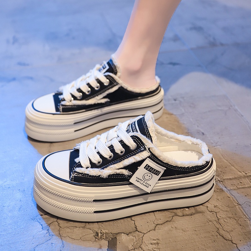 Closed Toe Slippers Women's Summer Outdoor Wear Canvas Shoes Heel-free Half Support Internet Celebrity Lazy Half Slippers Thick Bottom Sandals