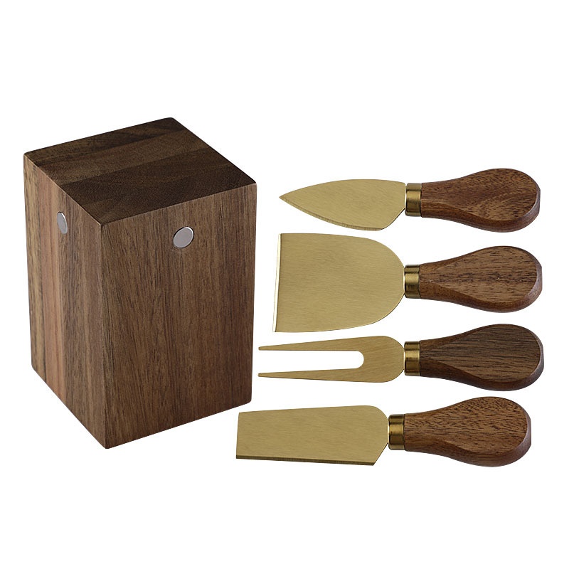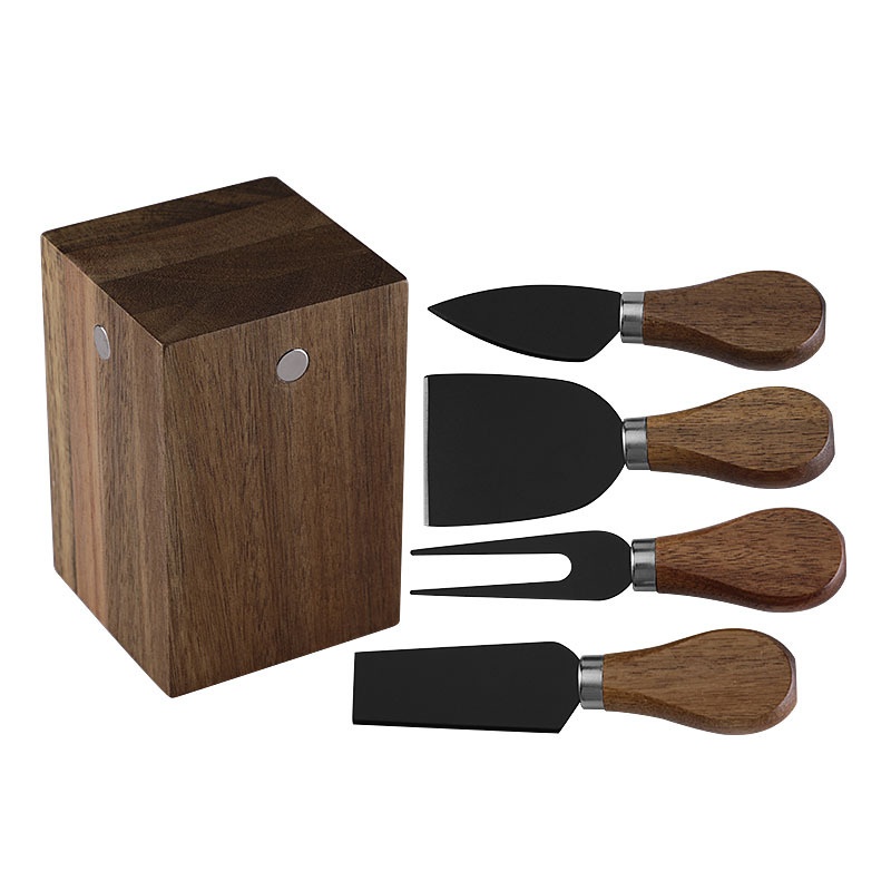 In Stock Acacia Wood Magnetic Cheese Knife Holder Cheese Knife And Fork Suit Stainless Steel Cheese Knife 5 Piece Set