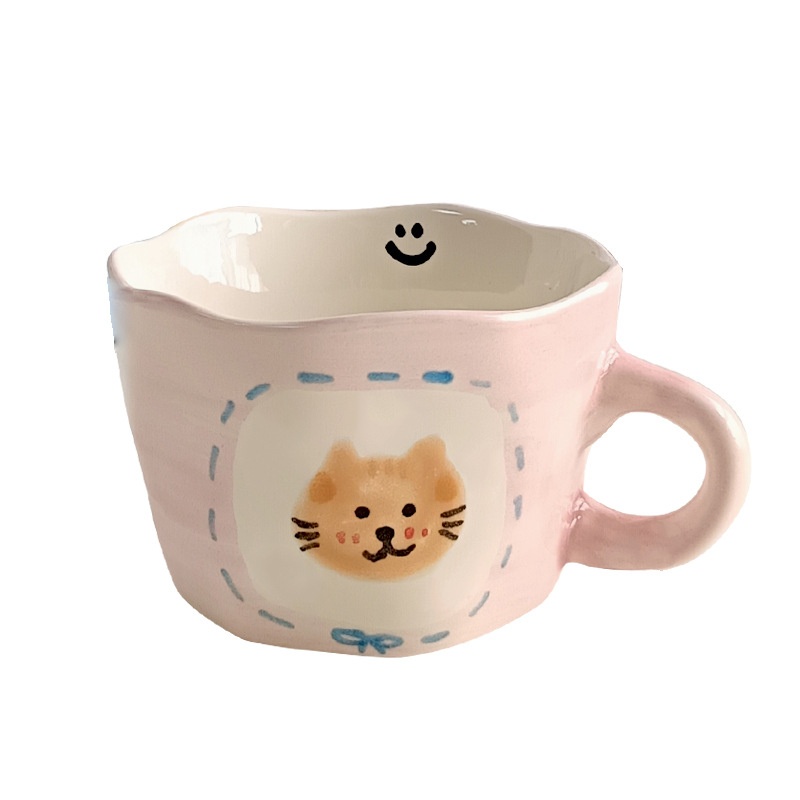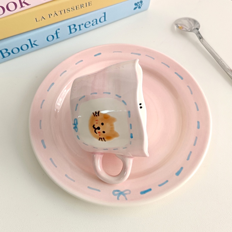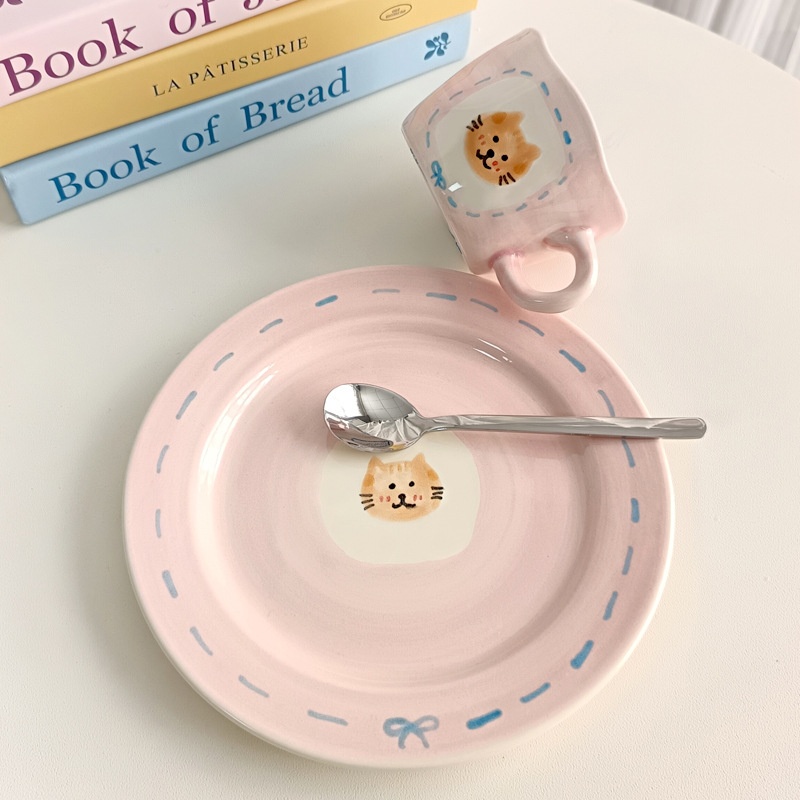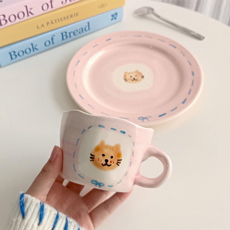 Cute Hand-painted Underglaze Kitten Ceramic Mug Pink Girly Heart Coffee Cup Saucer Dessert Breakfast Plate