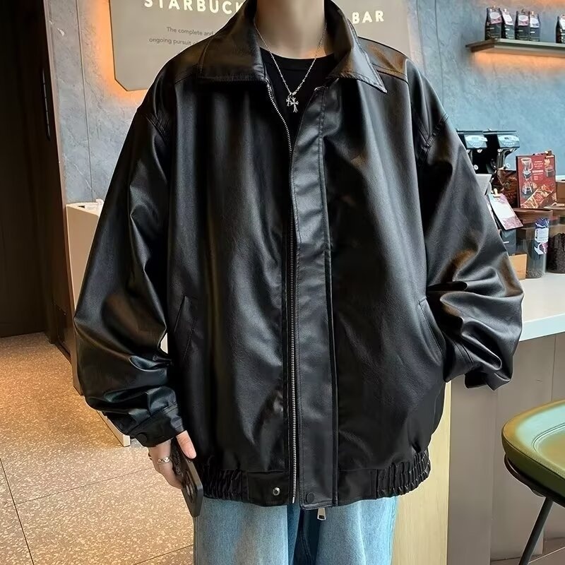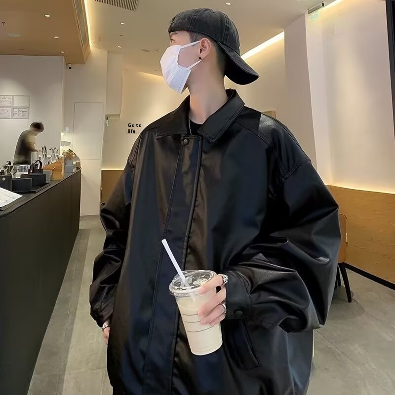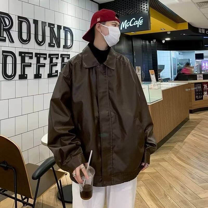 Spring And Autumn Korean Fashionable Handsome Motorcycle Jacket Brown Leather Loose Fried Street Jacket Men's Y