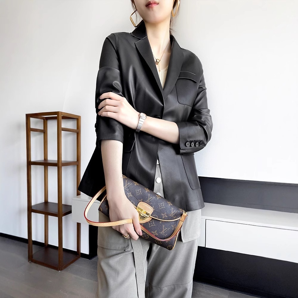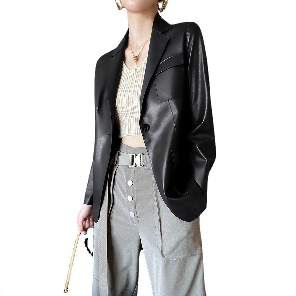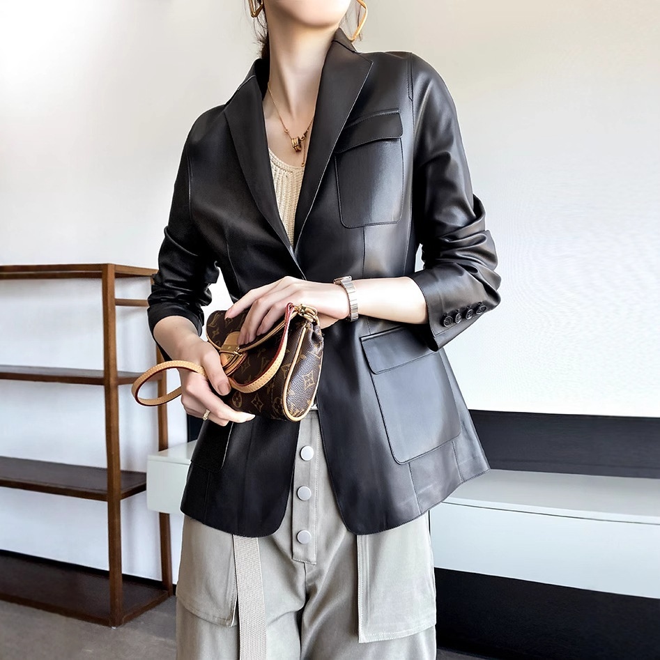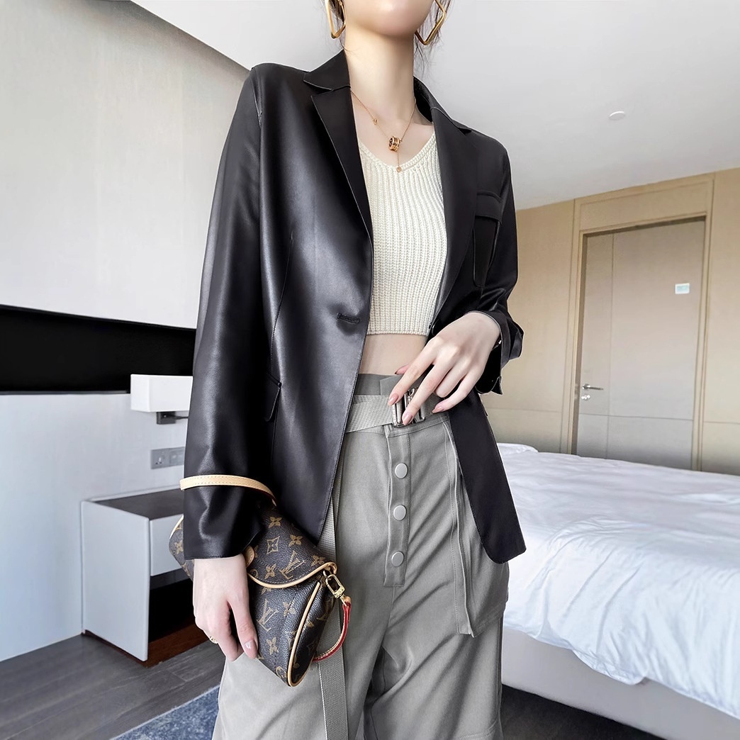 Haining Goatskin Genuine Leather Suit Jacket For Women Autumn Korean Style Slim Retro British Style Jacket