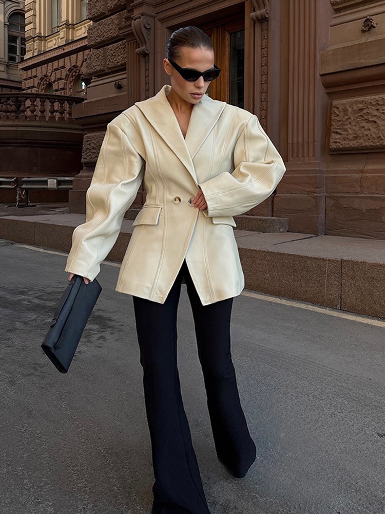 Korean Style Light Luxury Loose Solid Color Waist-Cinching Button Leather Jacket European And American Foreign Trade Model