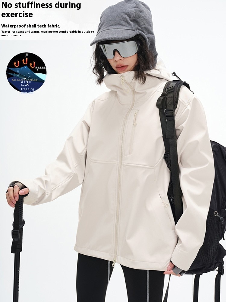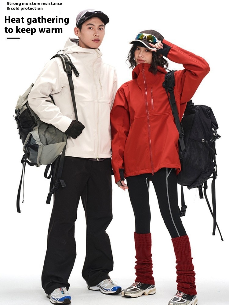 Outdoor Soft Shell Jacket Three-proof Hooded Autumn And Winter Plus Velvet Couple Style Splash-proof Jacket Mountaineering Clothing
