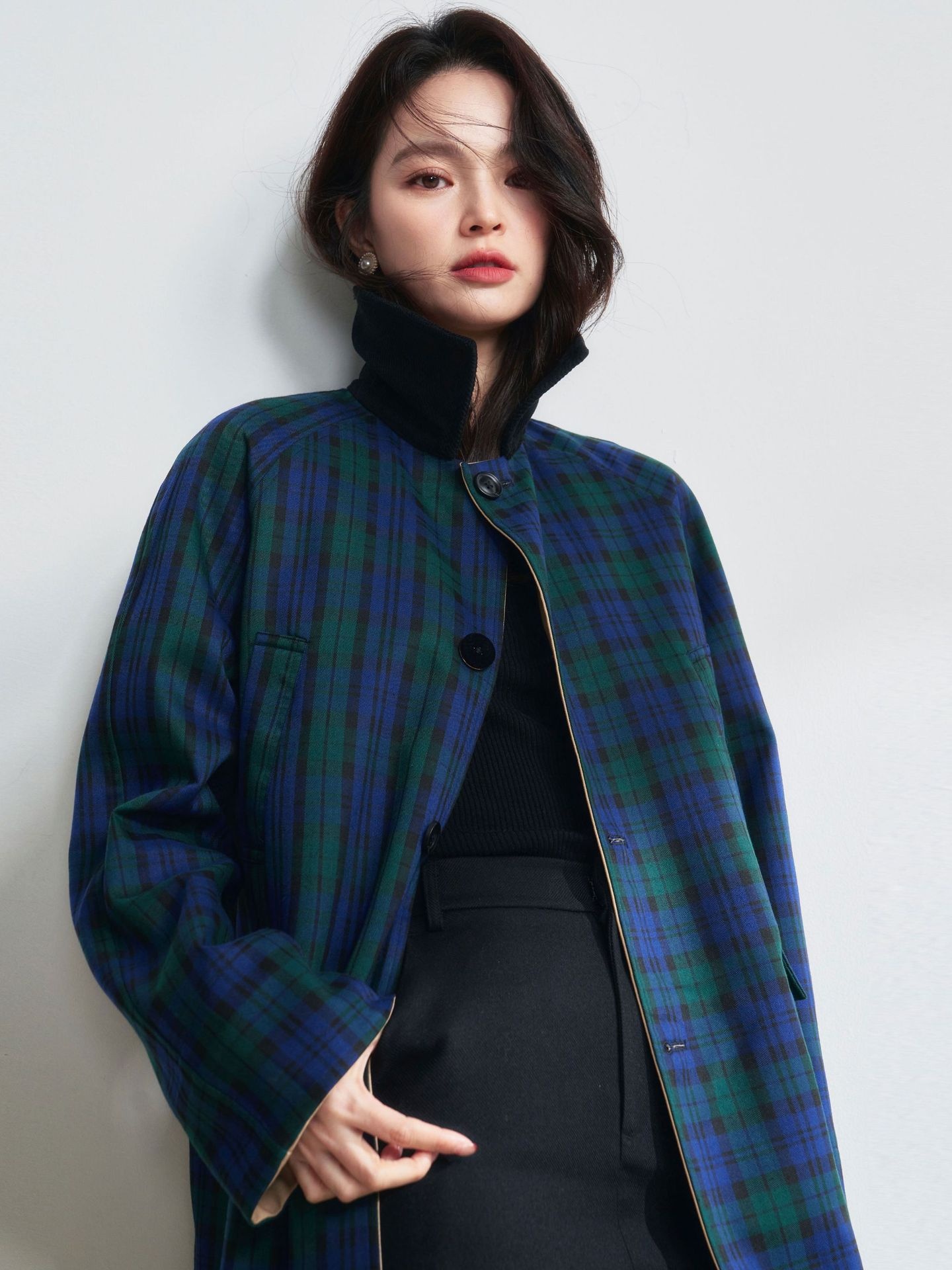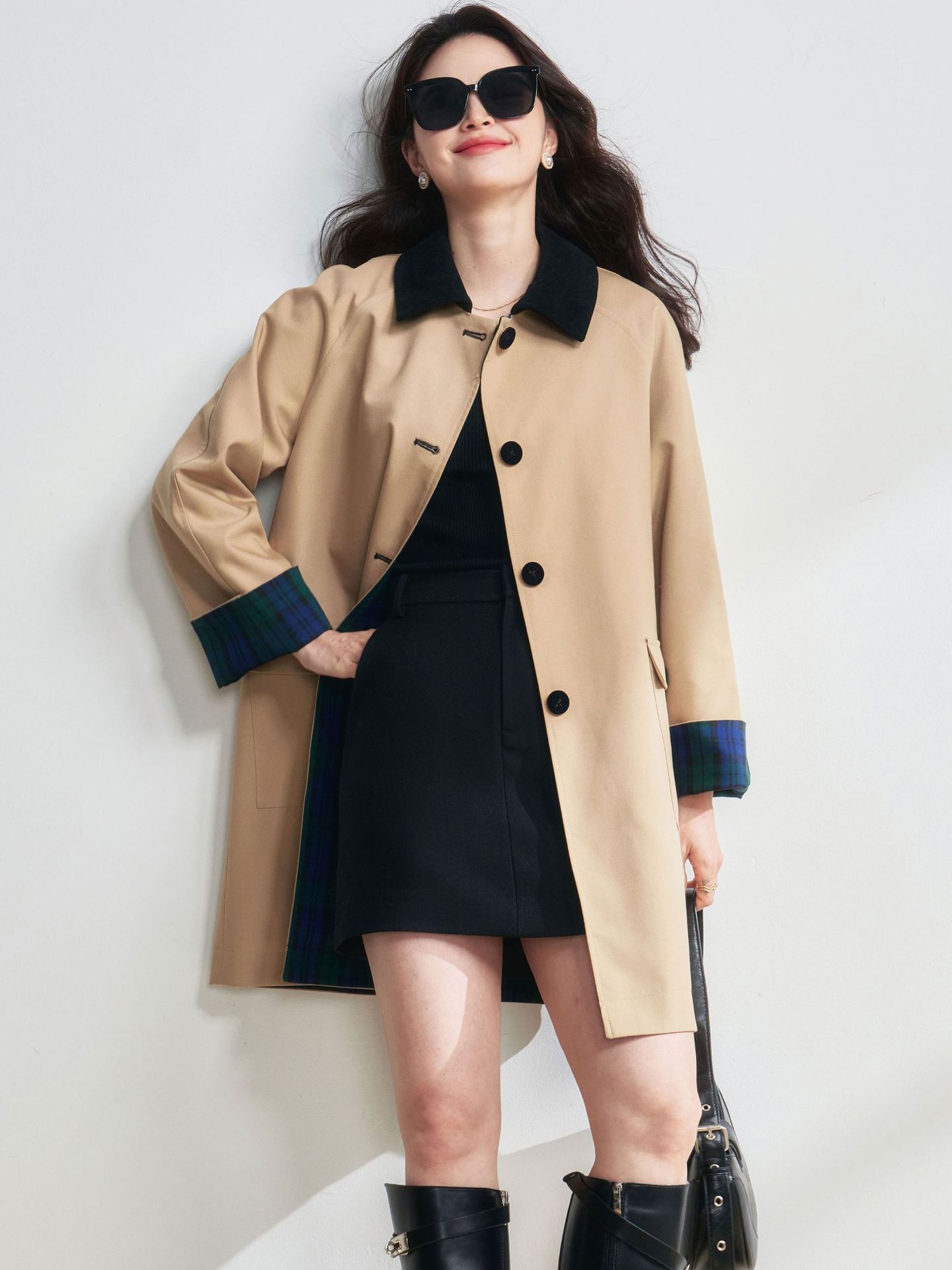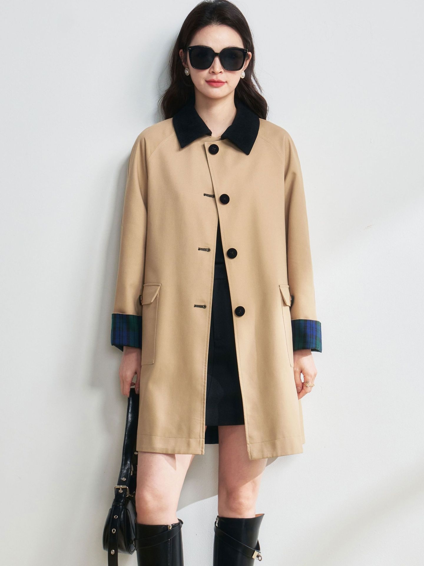 Retro Contrast Plaid Double-sided Khaki Mid-length Trench Coat