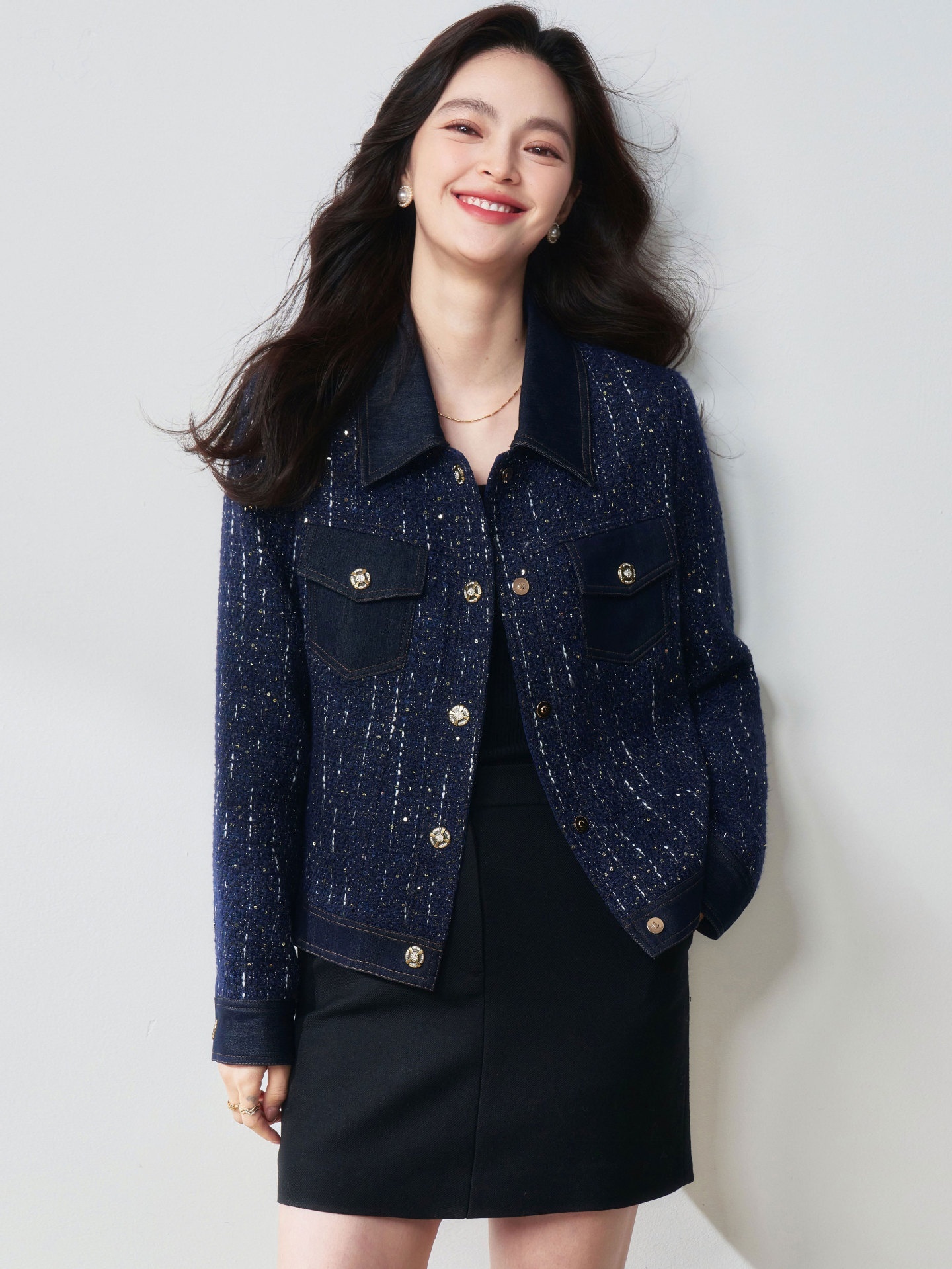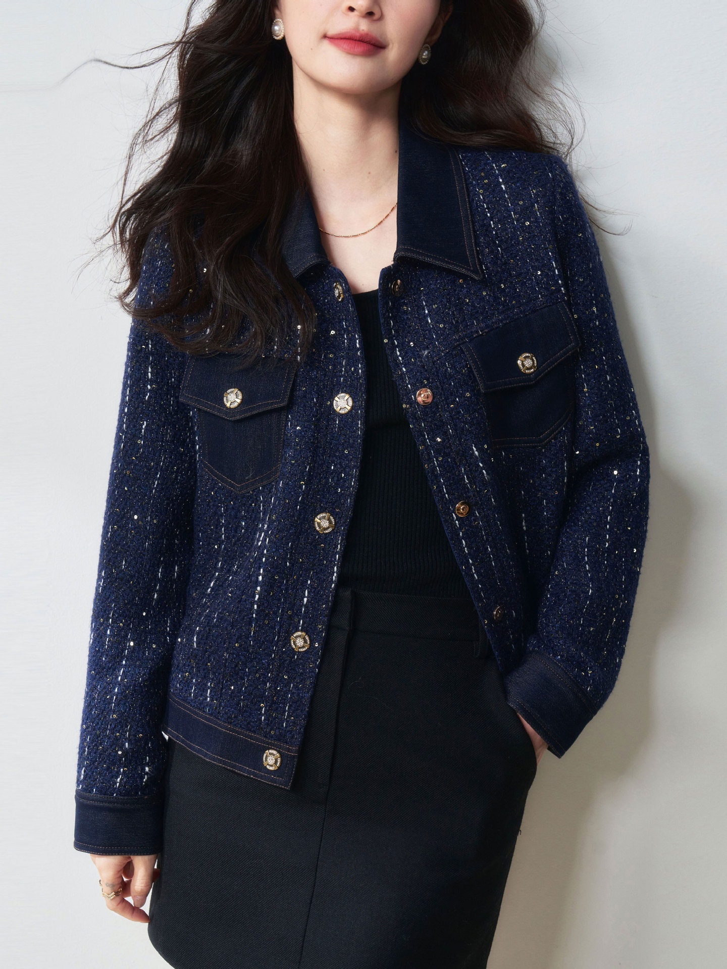 Blue Night Fashion Temperament Denim Splicing Navy Blue Floral Yarn Sequin Lapel Jacket