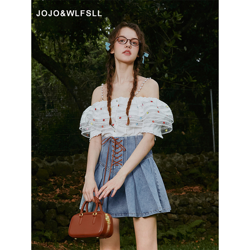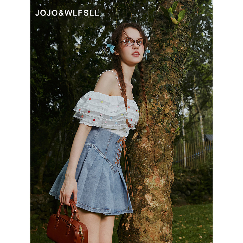 Retro-style High-waisted A-line Pleated Denim Mini Skirt With Tie-up Design