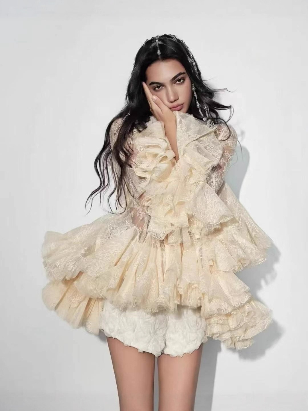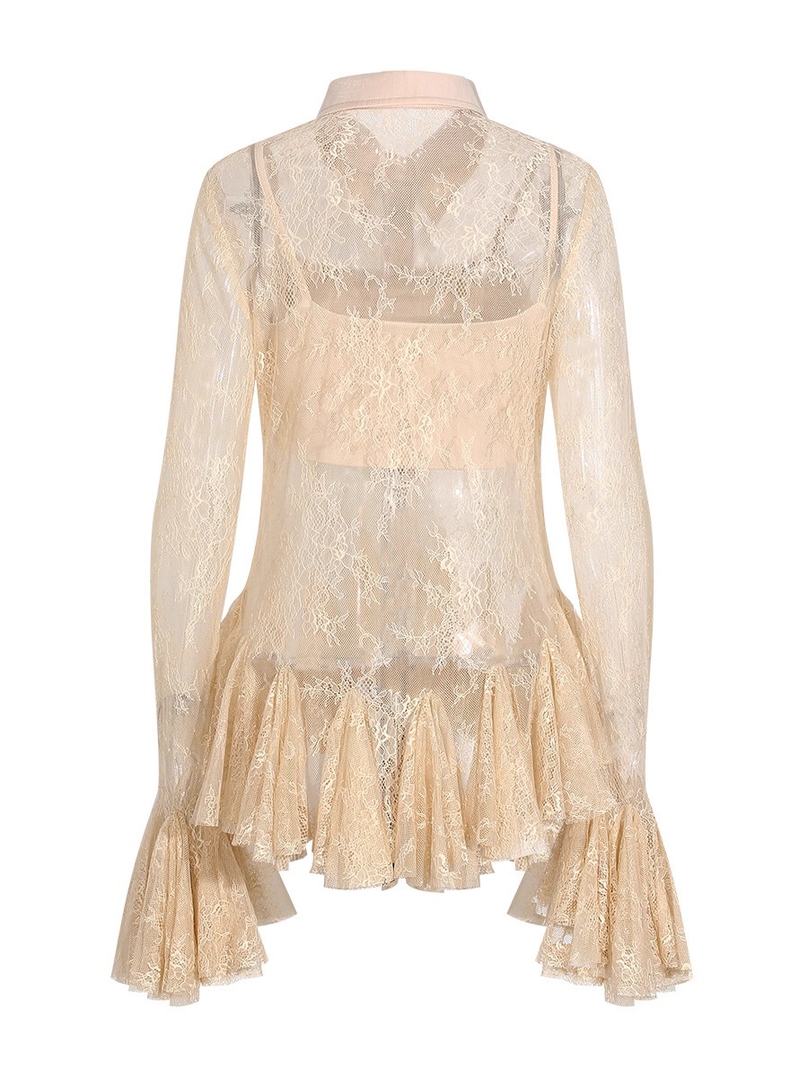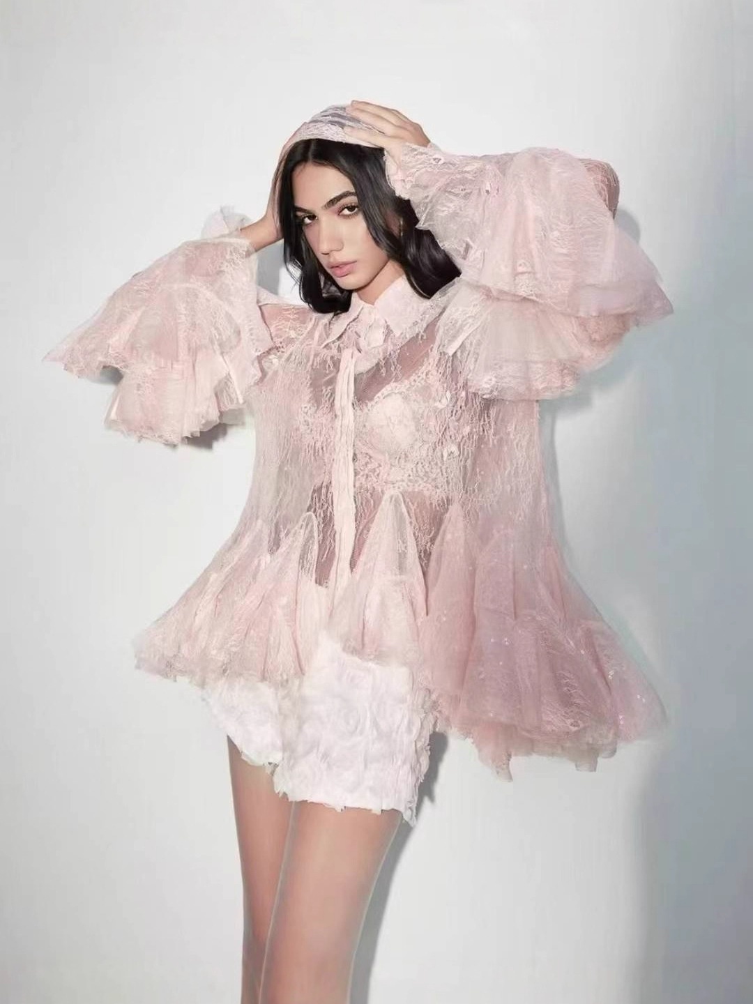 Lace-trimmed Bell Sleeves, Three-dimensional Floral Clusters, Puffy Sheer Lace Shirt