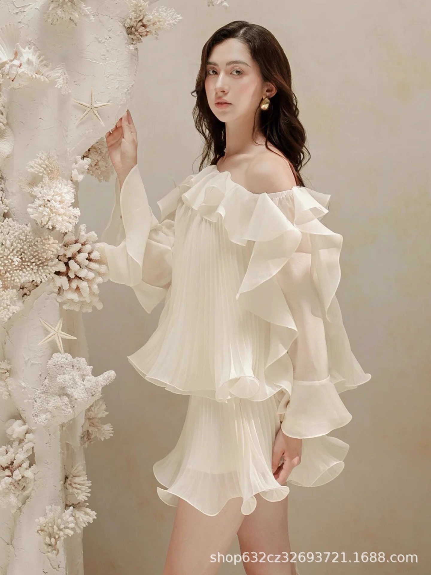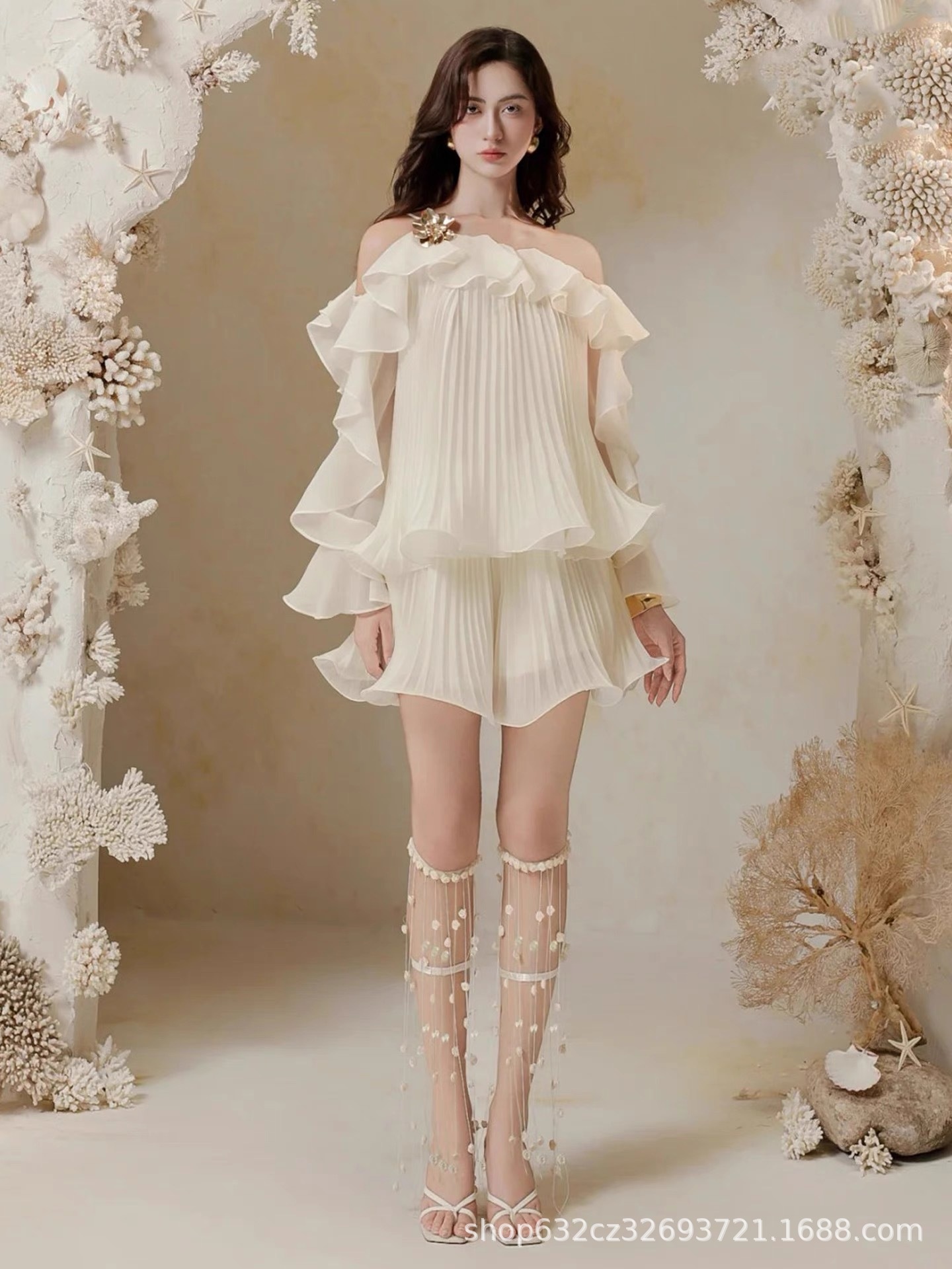 Two-piece Set: Ruffled Off-shoulder Top And Pleated Skirt