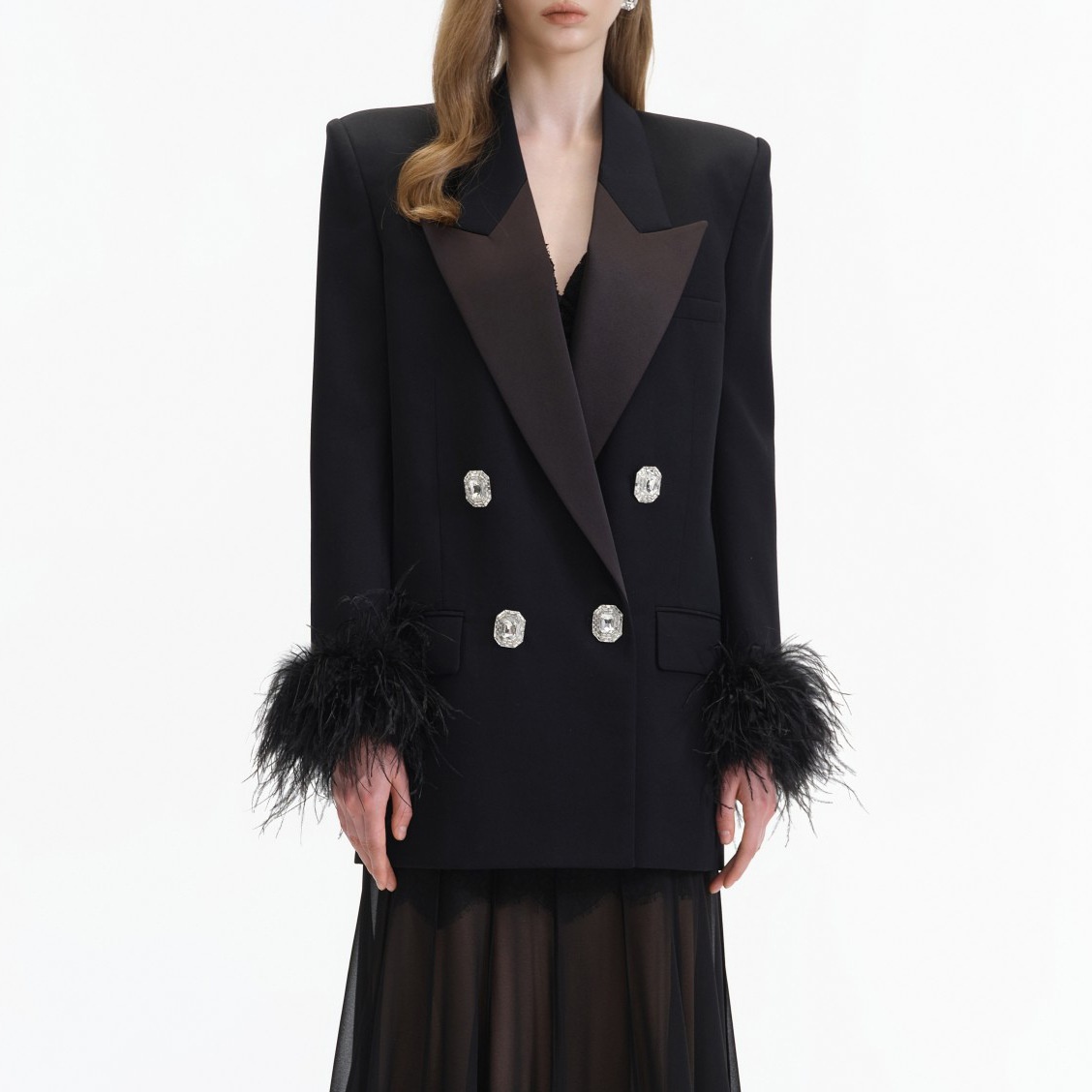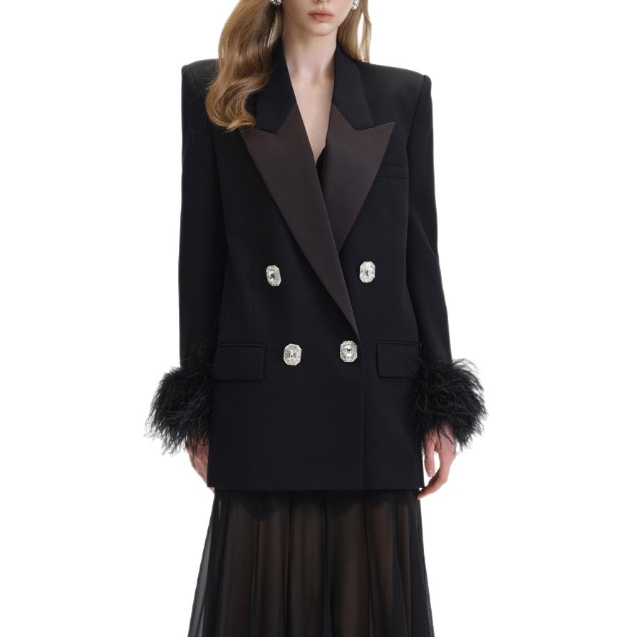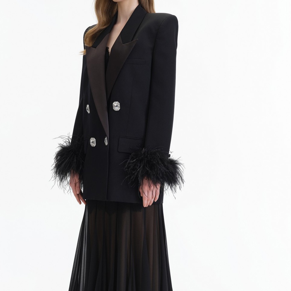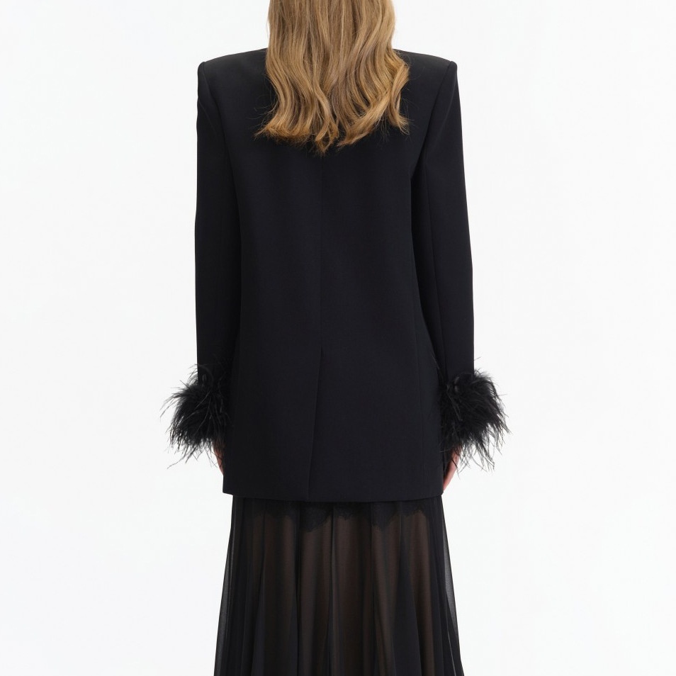 Black Satin-trimmed Suit Jacket With Rhinestone-embellished Feather Sleeves
