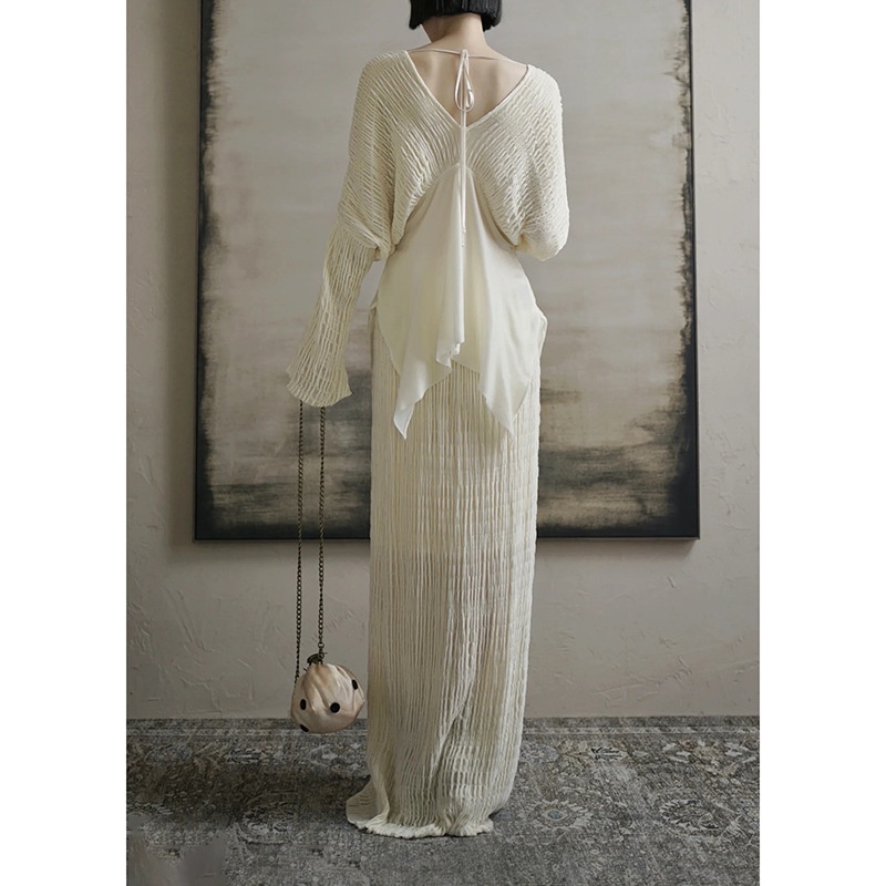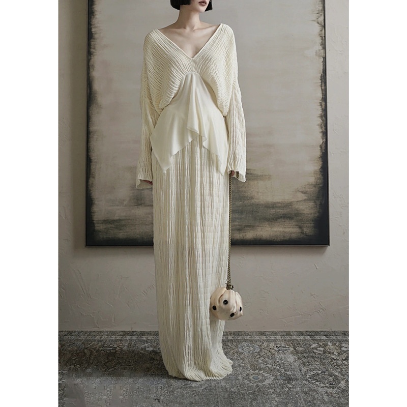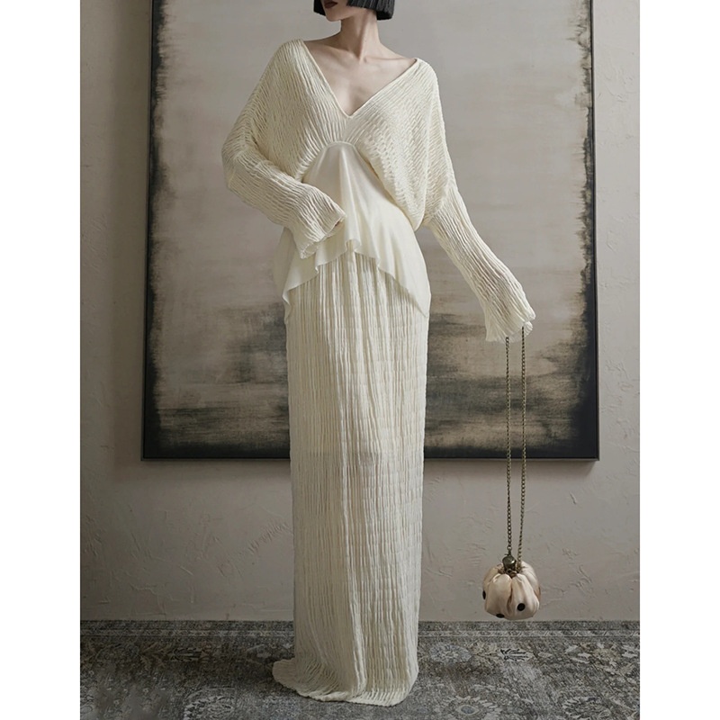 In-Stock Lazy Retro Pleated Texture V-Neck Batwing Sleeve Patchwork Irregular Top Straight Skirt Long Set
