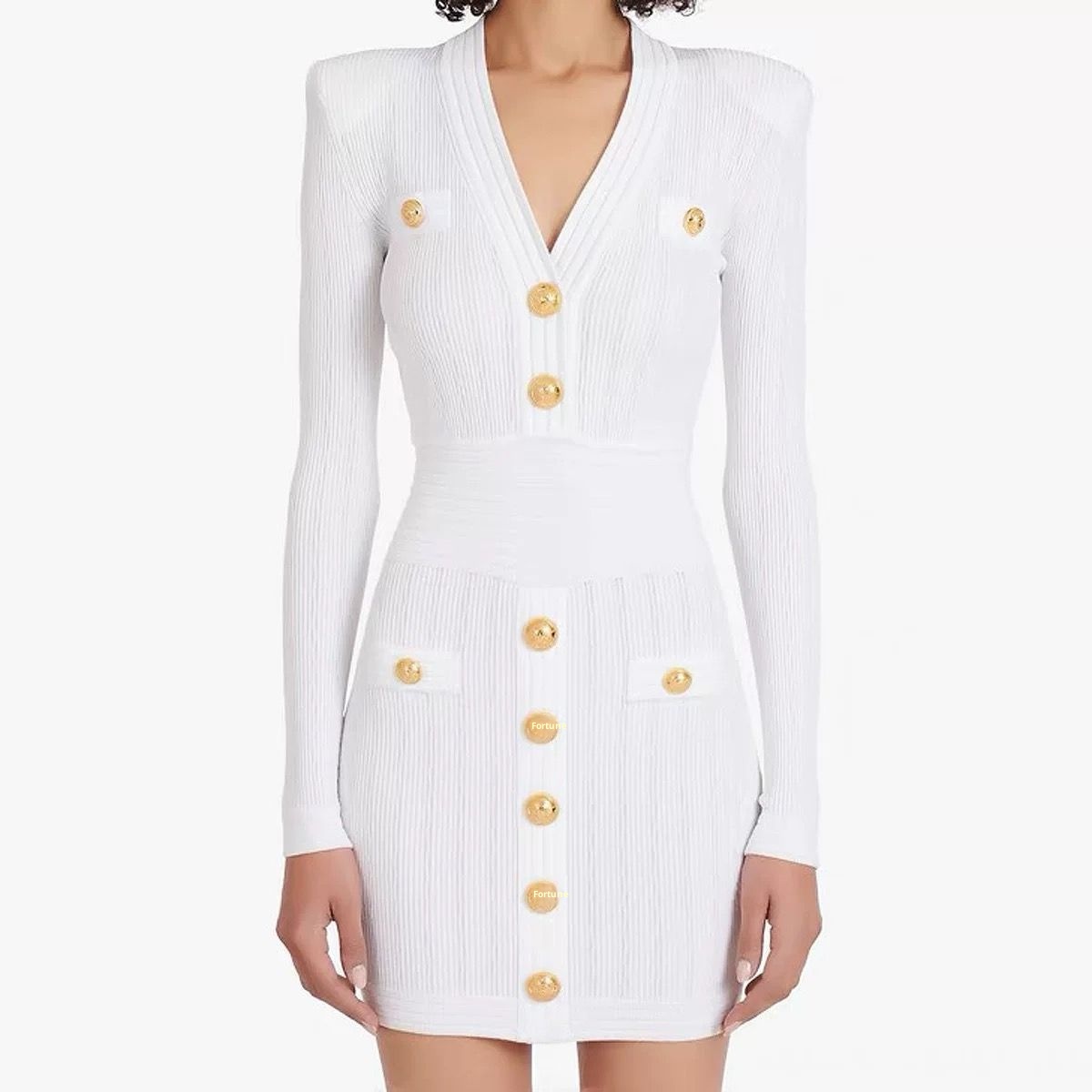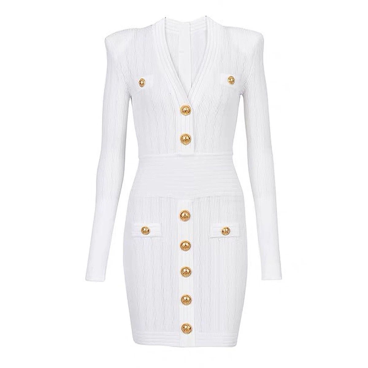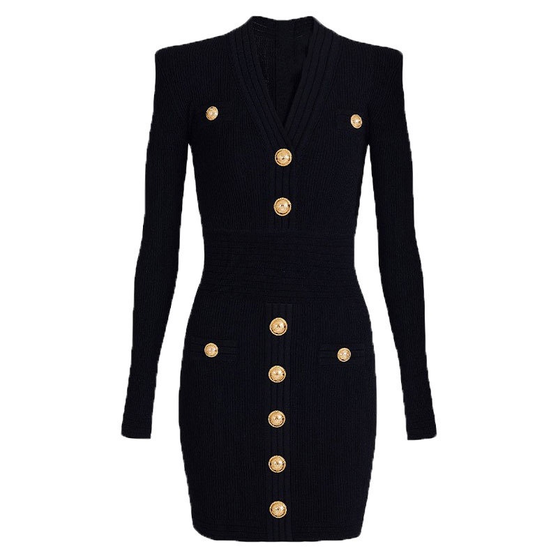 Bajia Autum Small Fragrance Celebrity Metal Button Long-Sleeved V Neck Sexy Knitted Dress For Women