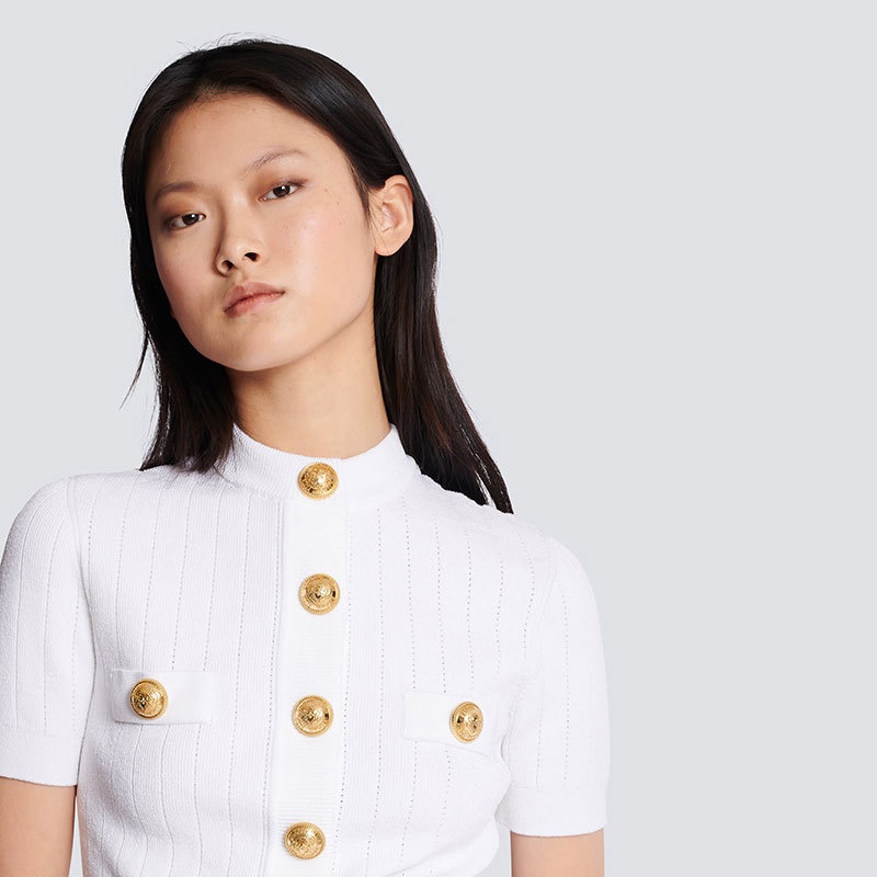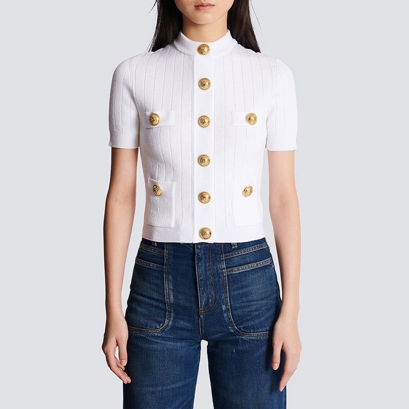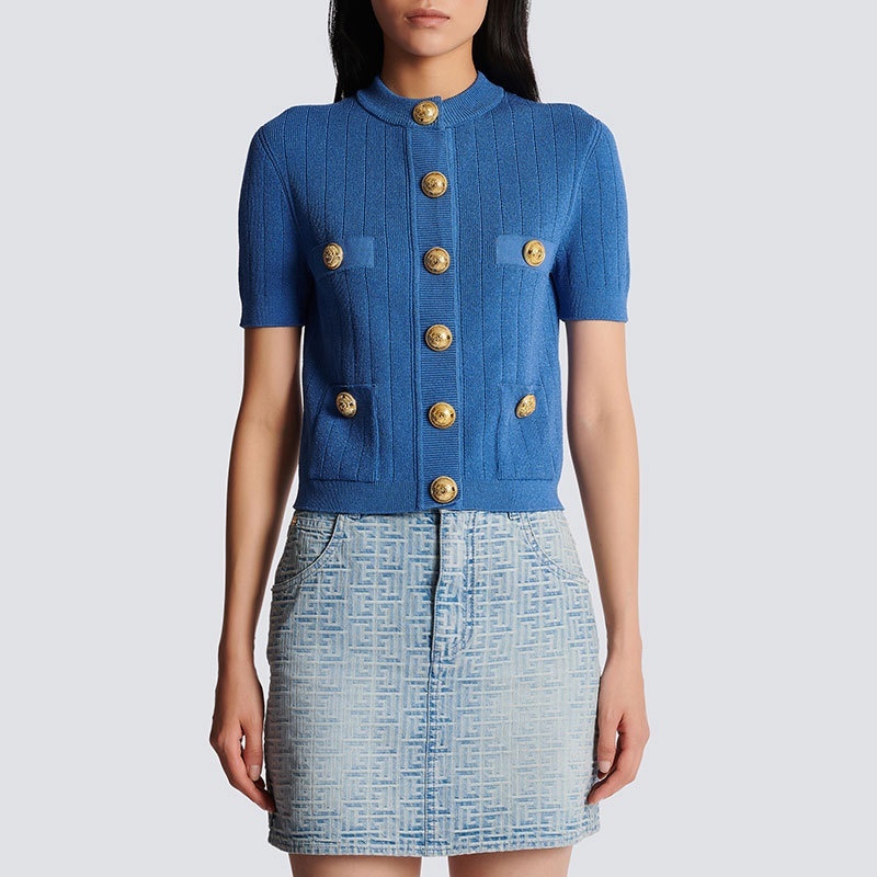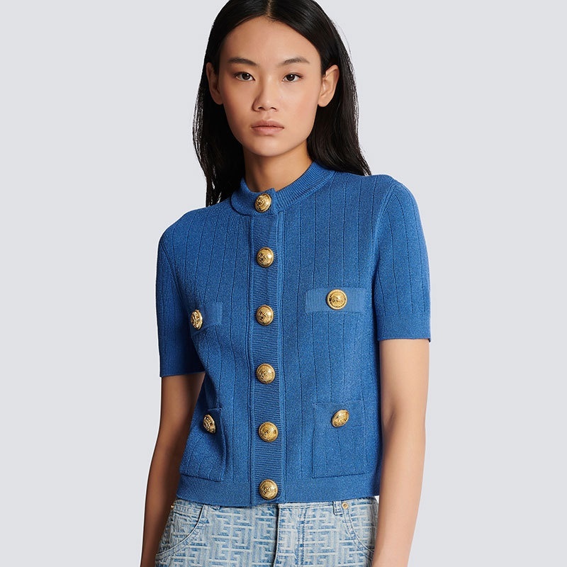 Gold-buttoned Vintage-style Klein Blue Knit Cardigan