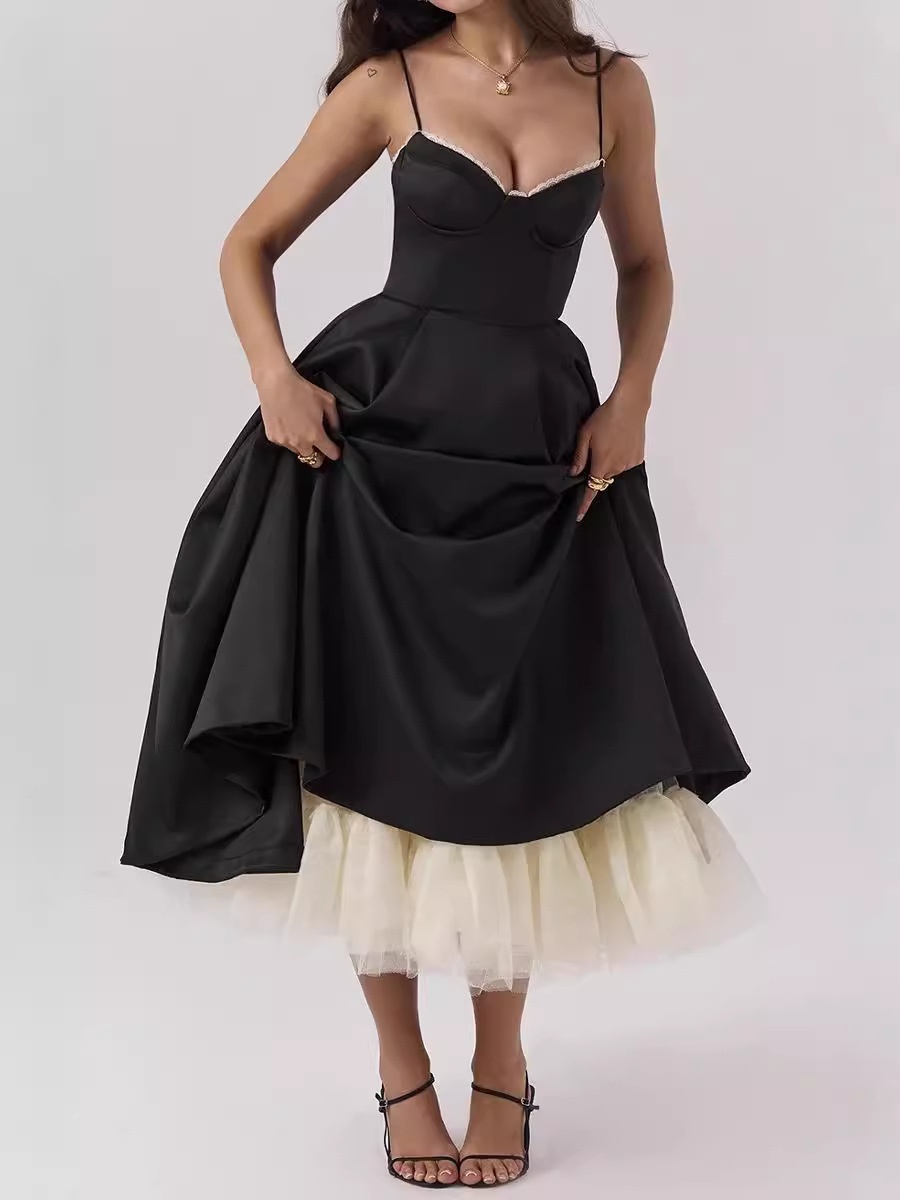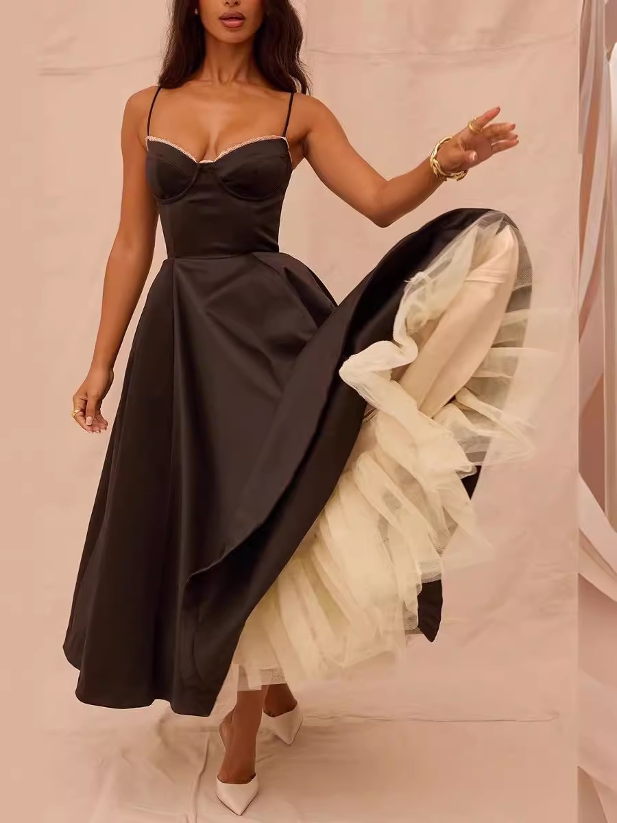 French Style BlAck Suspender Dress Women's Niche Design WAist Slimming Look Long Skirt Dress A-line LArge Skirt