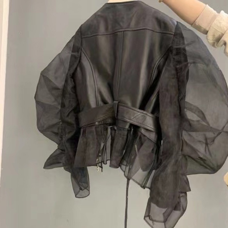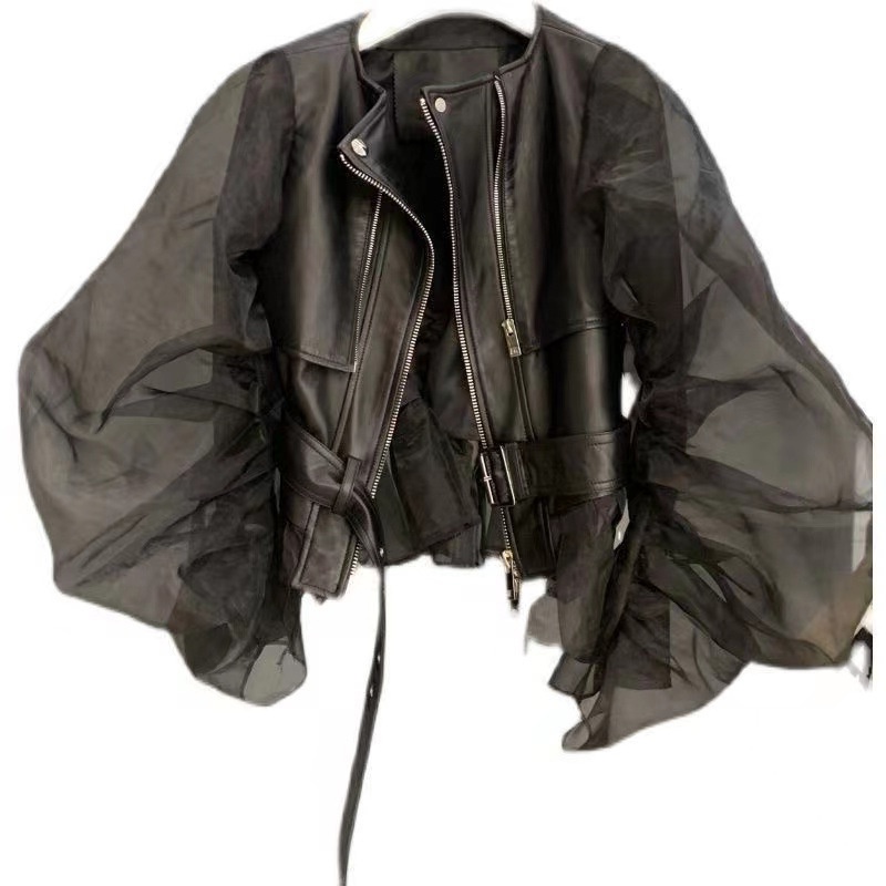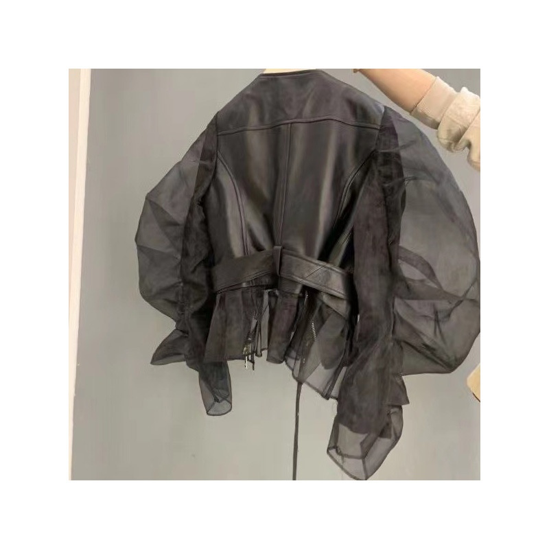 Short Cardigan With Organza Puff Sleeves And Ruffled Hem - A Stylish Leather Jacket