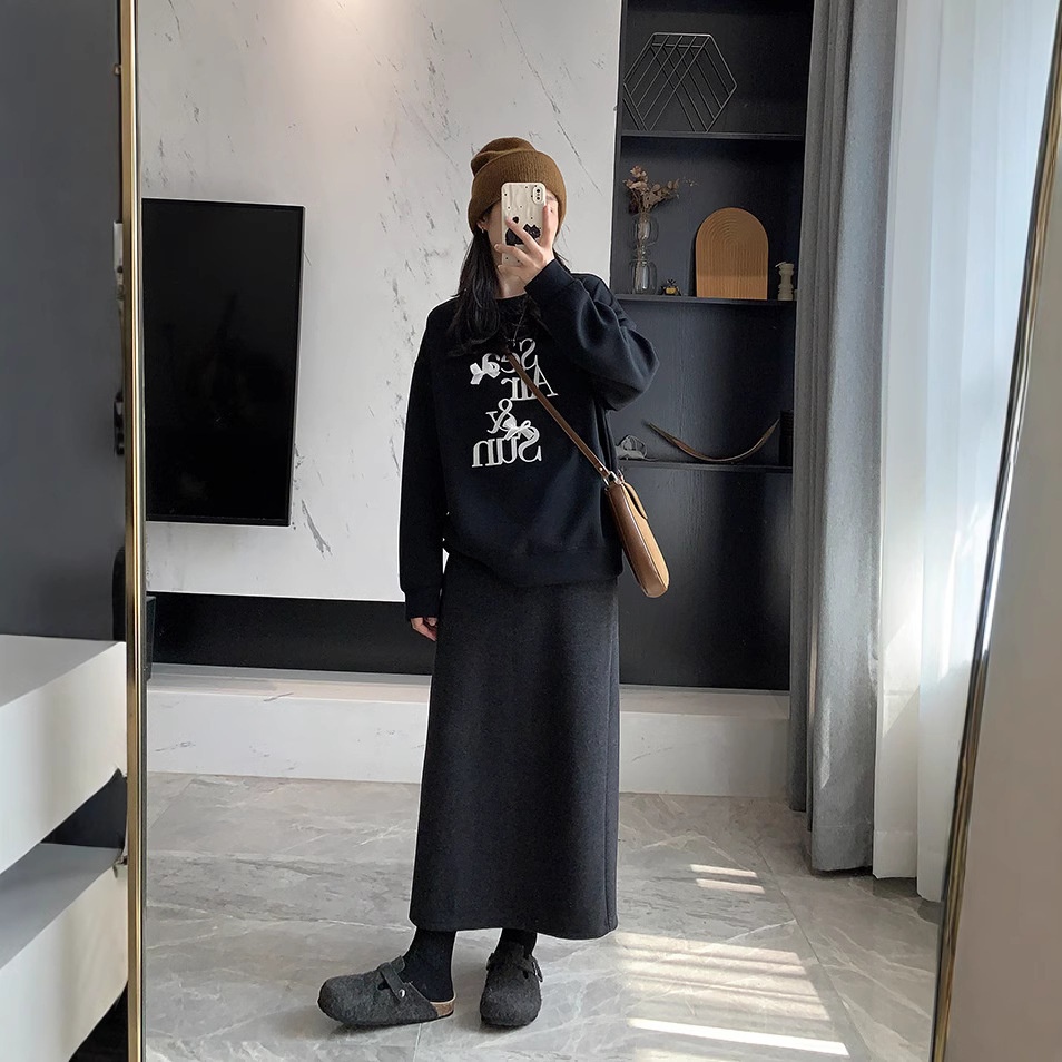 羊毛裙直筒顯瘦高腰開叉中長款半身裙
