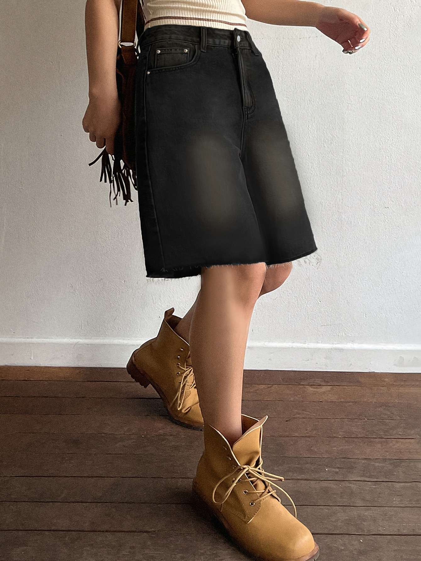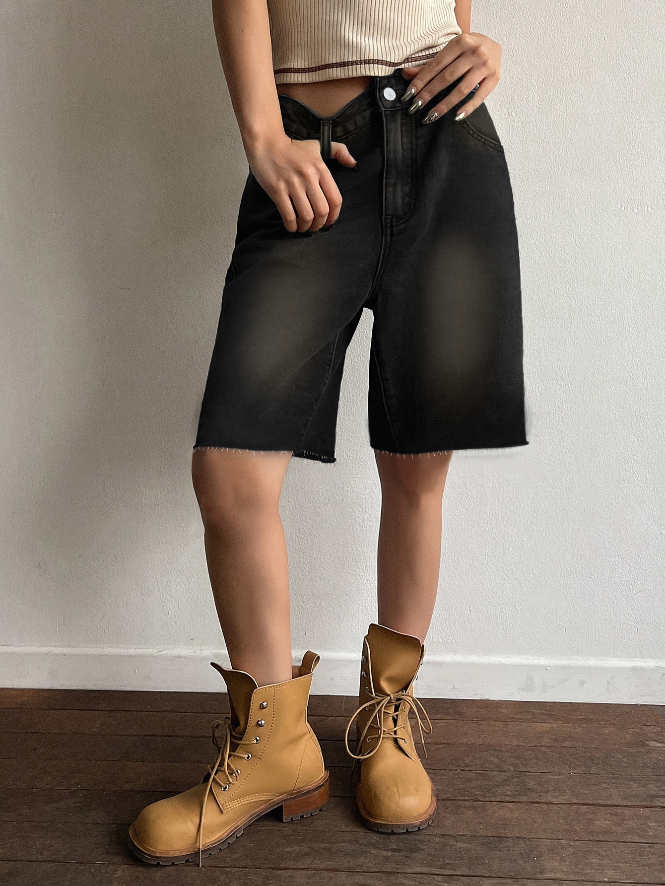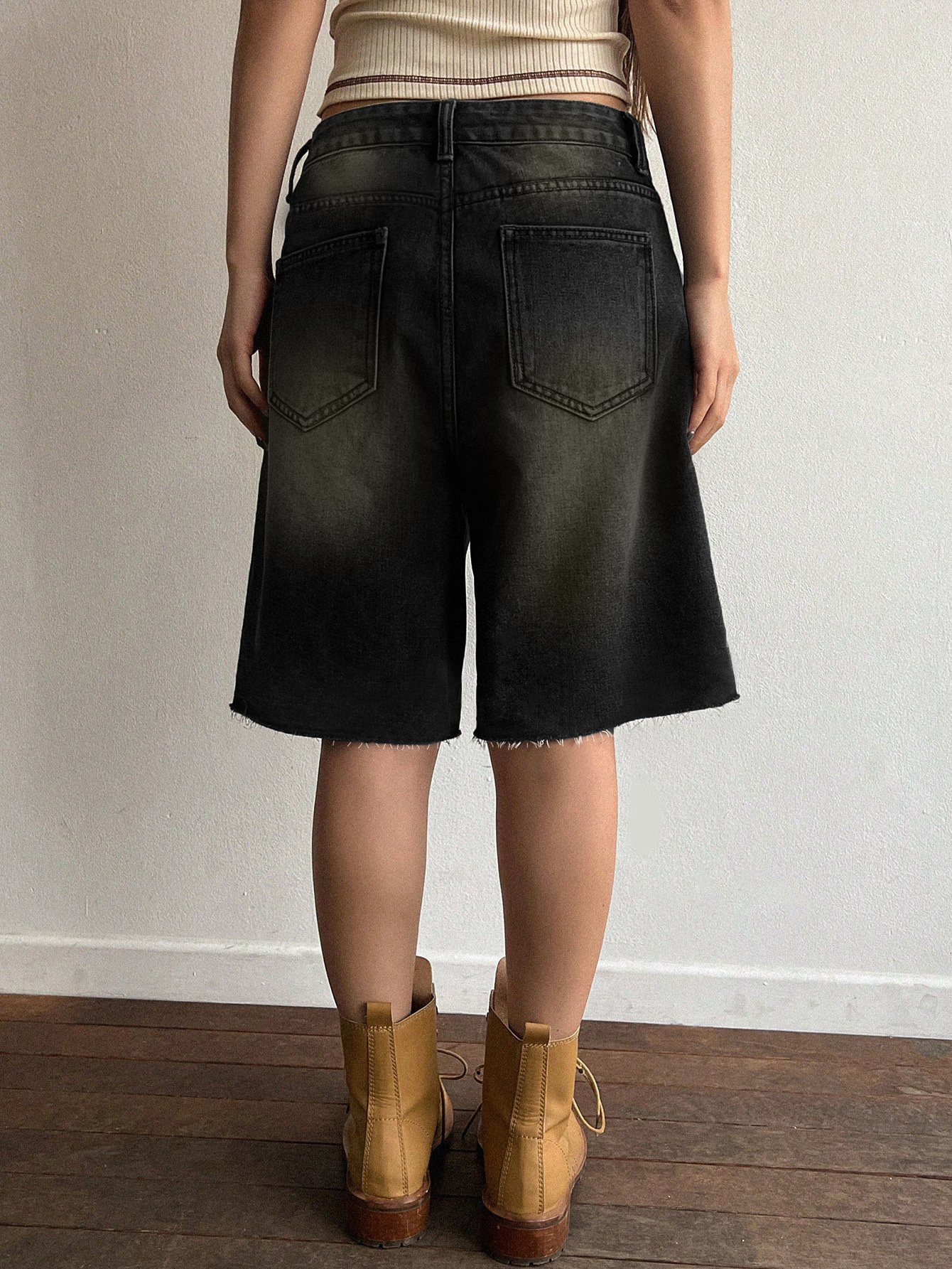 American Style Black Denim Retro Shorts Loose Shorts Wide Leg Straight Shorts
