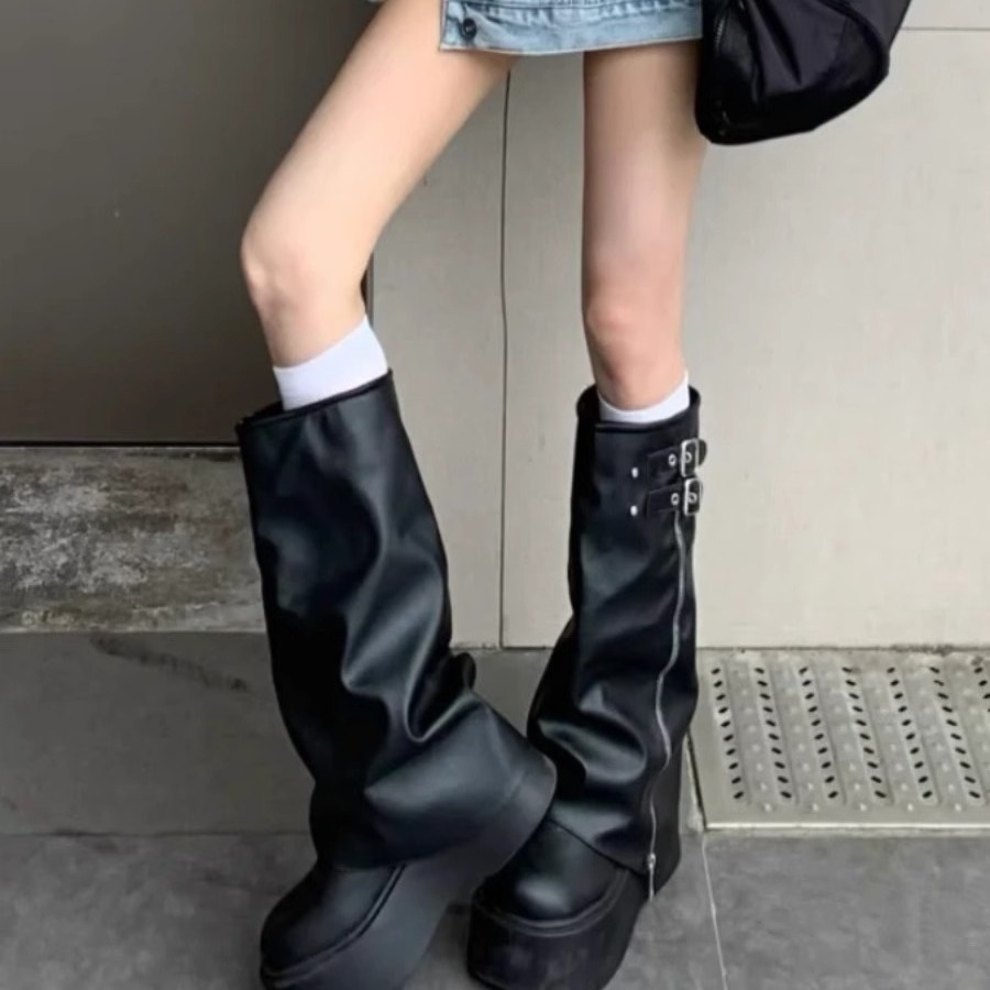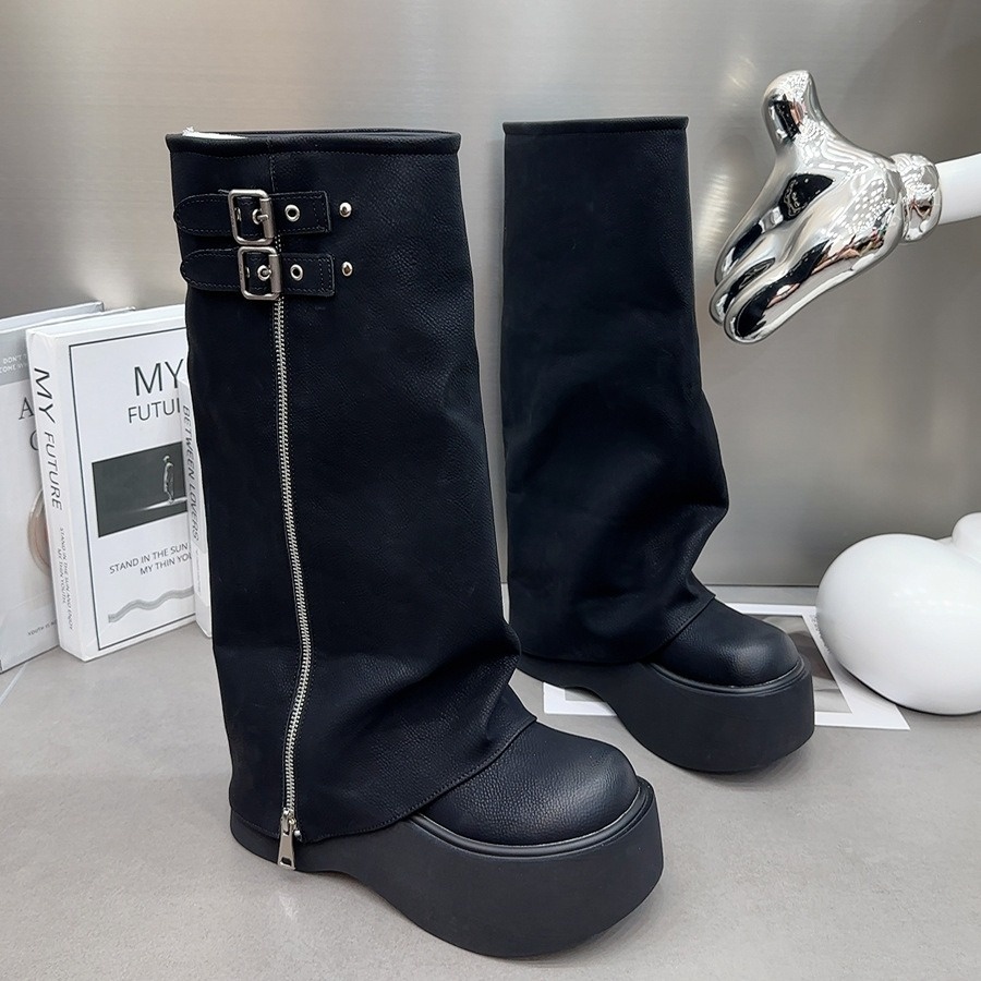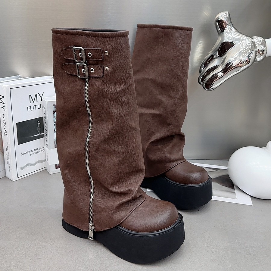 Genuine Leather Big Head Trouser Boots Sweet Cool Style Hot Girl Pile Boots Thick Sole Western Boots