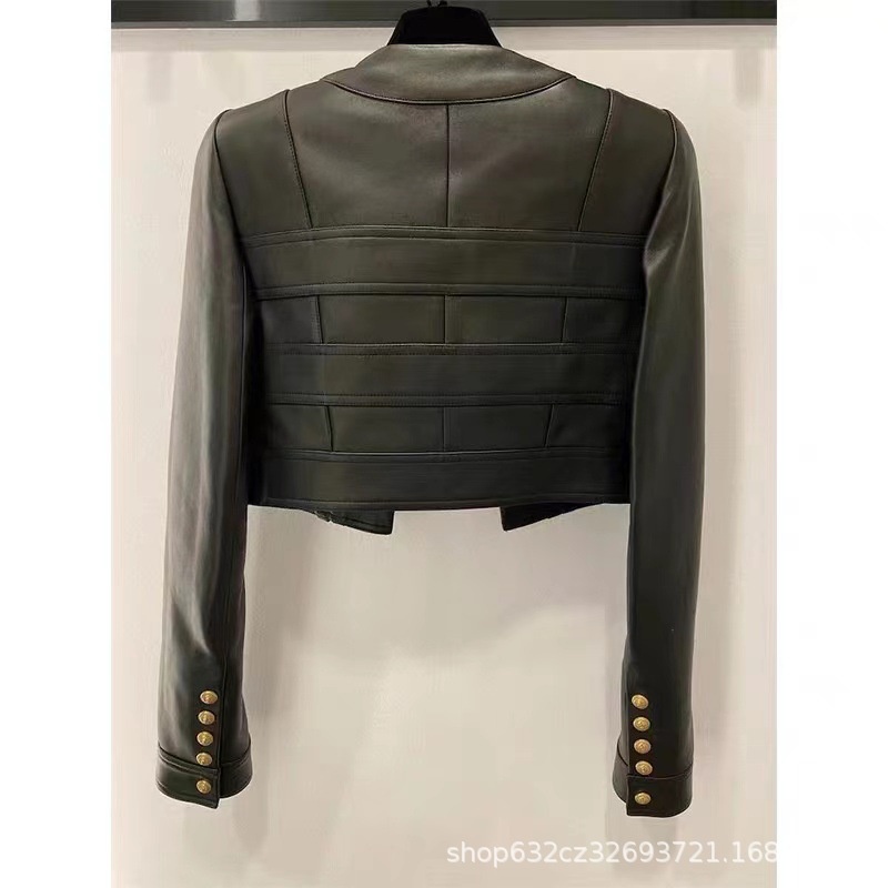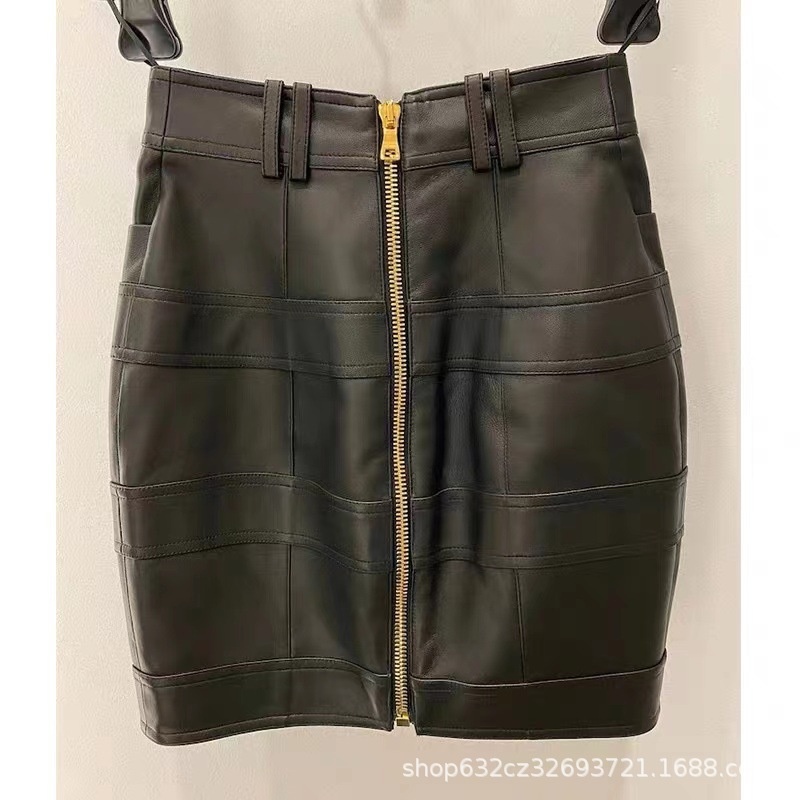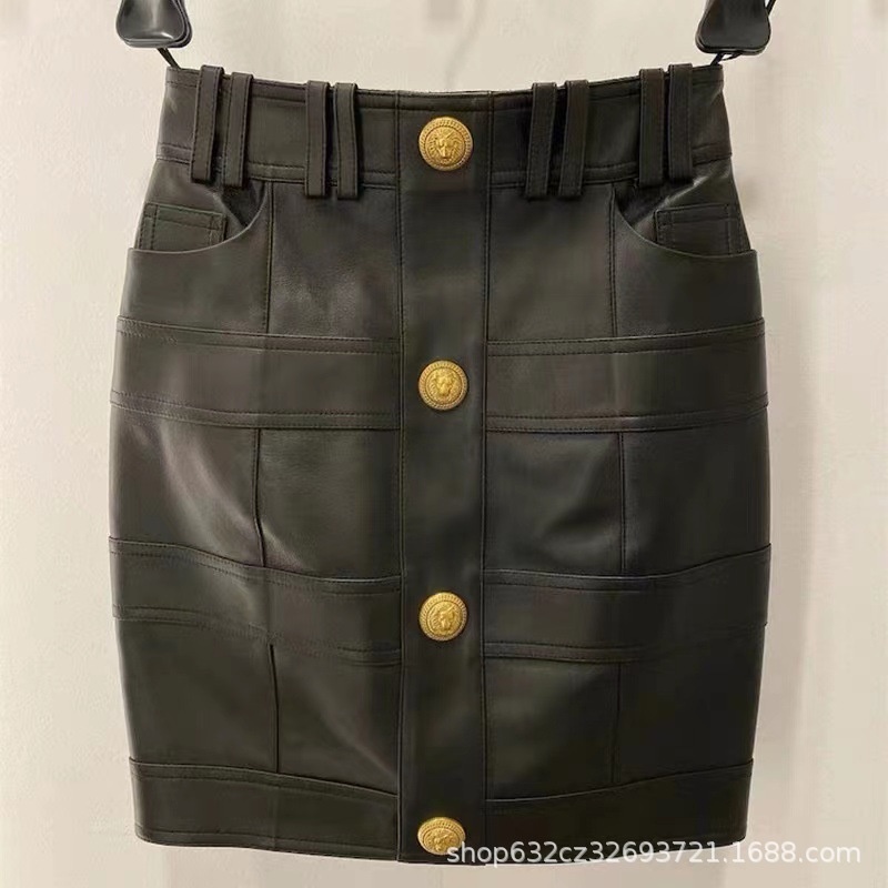 Chic And Fashionable Leather Jacket And Metal Button Skirt Suit