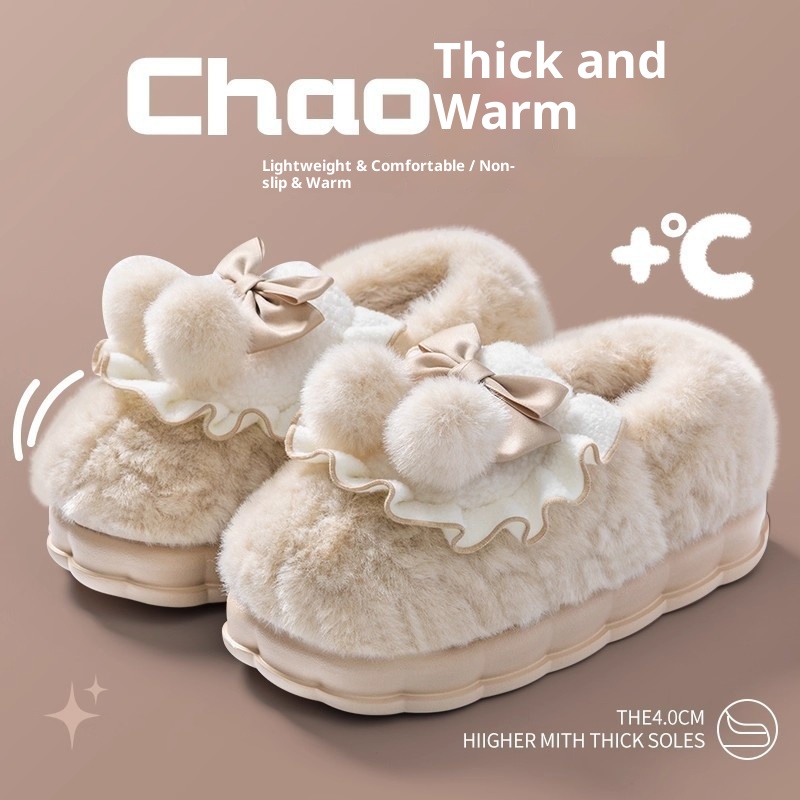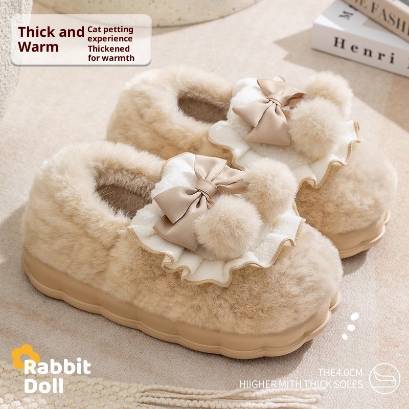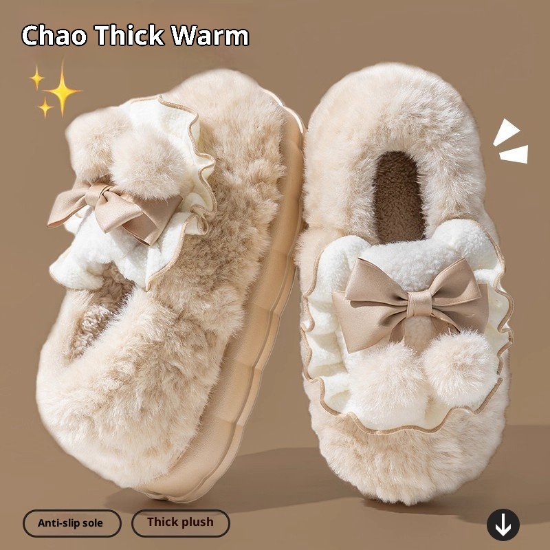 Bowknot Cotton Slippers For Women Indoor Home Thick-soled Non-slip Warm Plush Heel Cotton Shoes