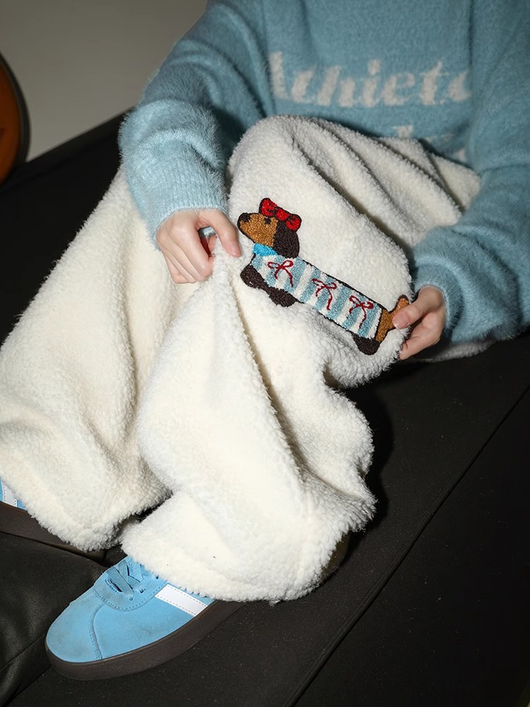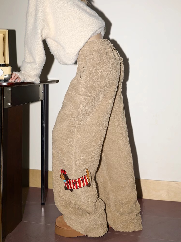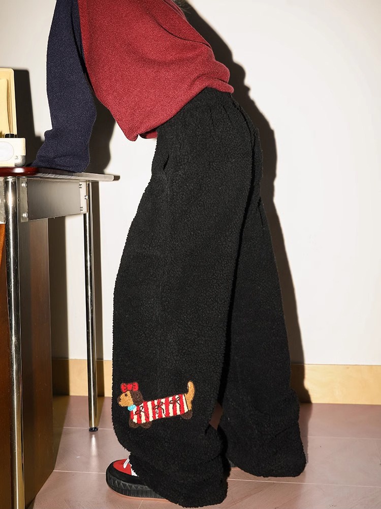 Dachshund Dog Embroidered Fleece Pants For Men And Women Winter Thickened Cotton Pants Northeast Cold-proof Equipment Small Wide-leg Pants