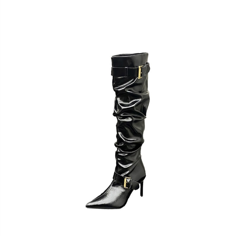 Spicy Pointed-toe White Slouch Boots, High-heeled Knee-high Boots, Women's High-heeled Boots With Buckle