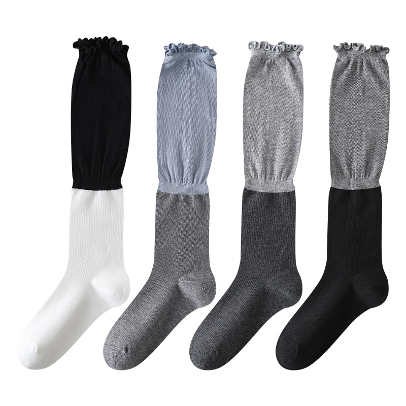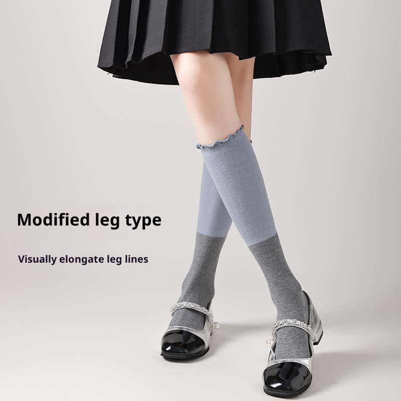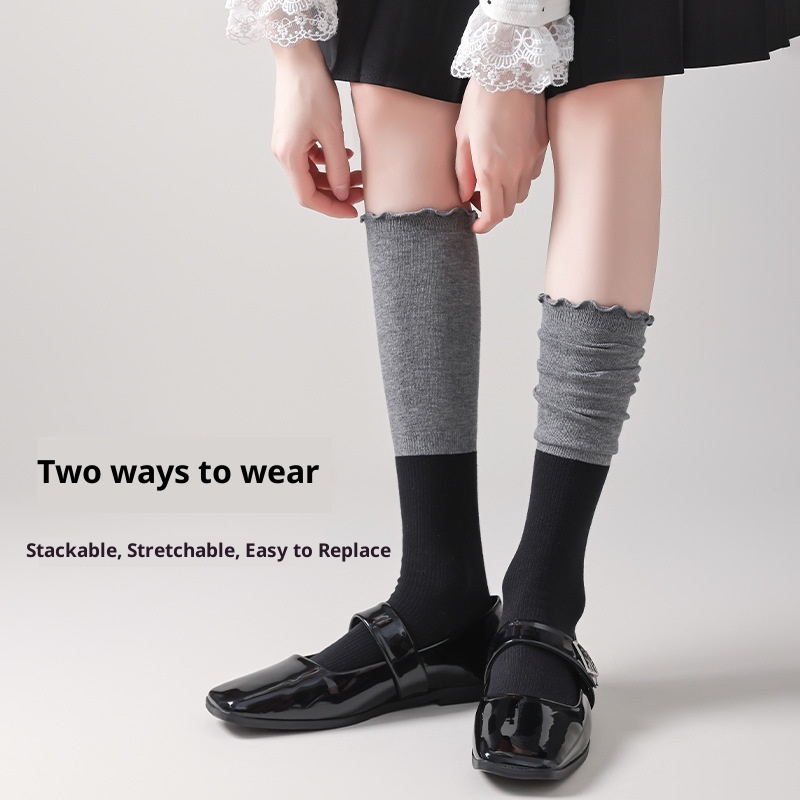 Spring Socks Japanese Color Matching Wooden Ear Women's Calf Socks Simple Versatile Knee-high Piled Socks Cotton