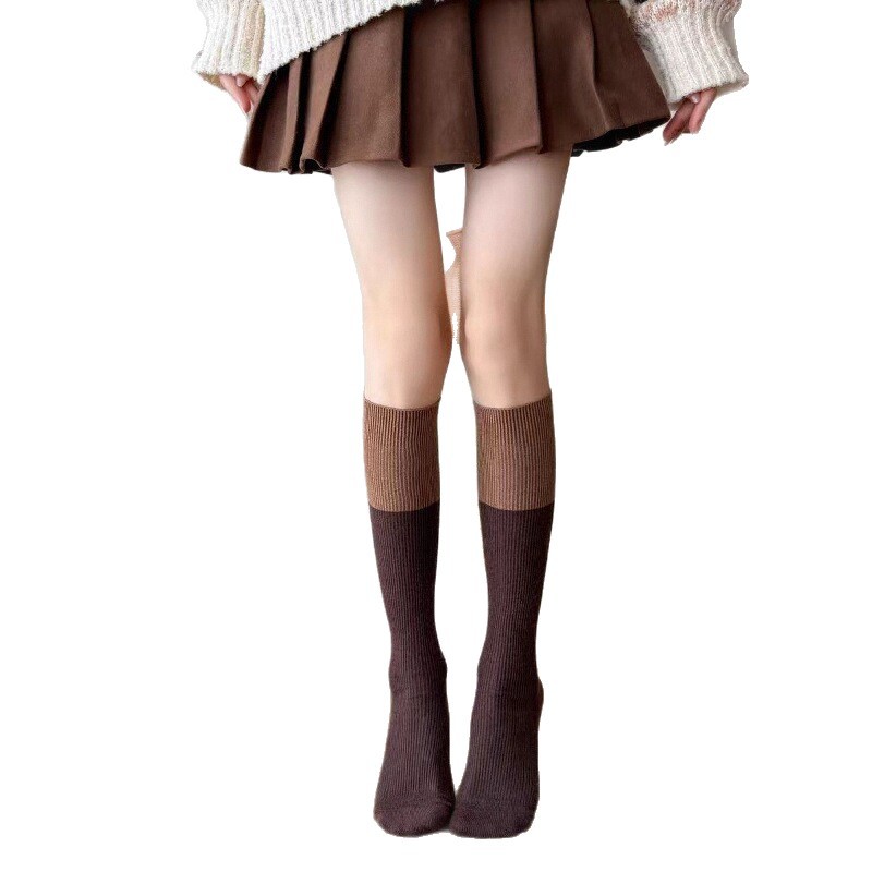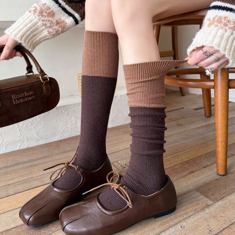 Brown Calf Socks For Women, Slimming Patchwork Stockings, Japanese Style JK Mid-calf Slouch, Knee-high Socks, Spring And Autumn Long Socks