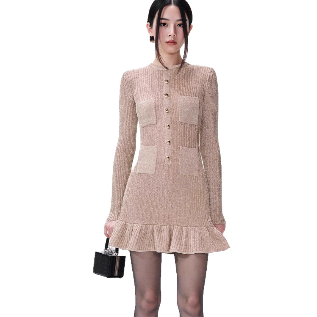 Socialite And Sexy Girl's Single-breasted Round Neck Fitted Waist Long-sleeved Short Pleated Skirt