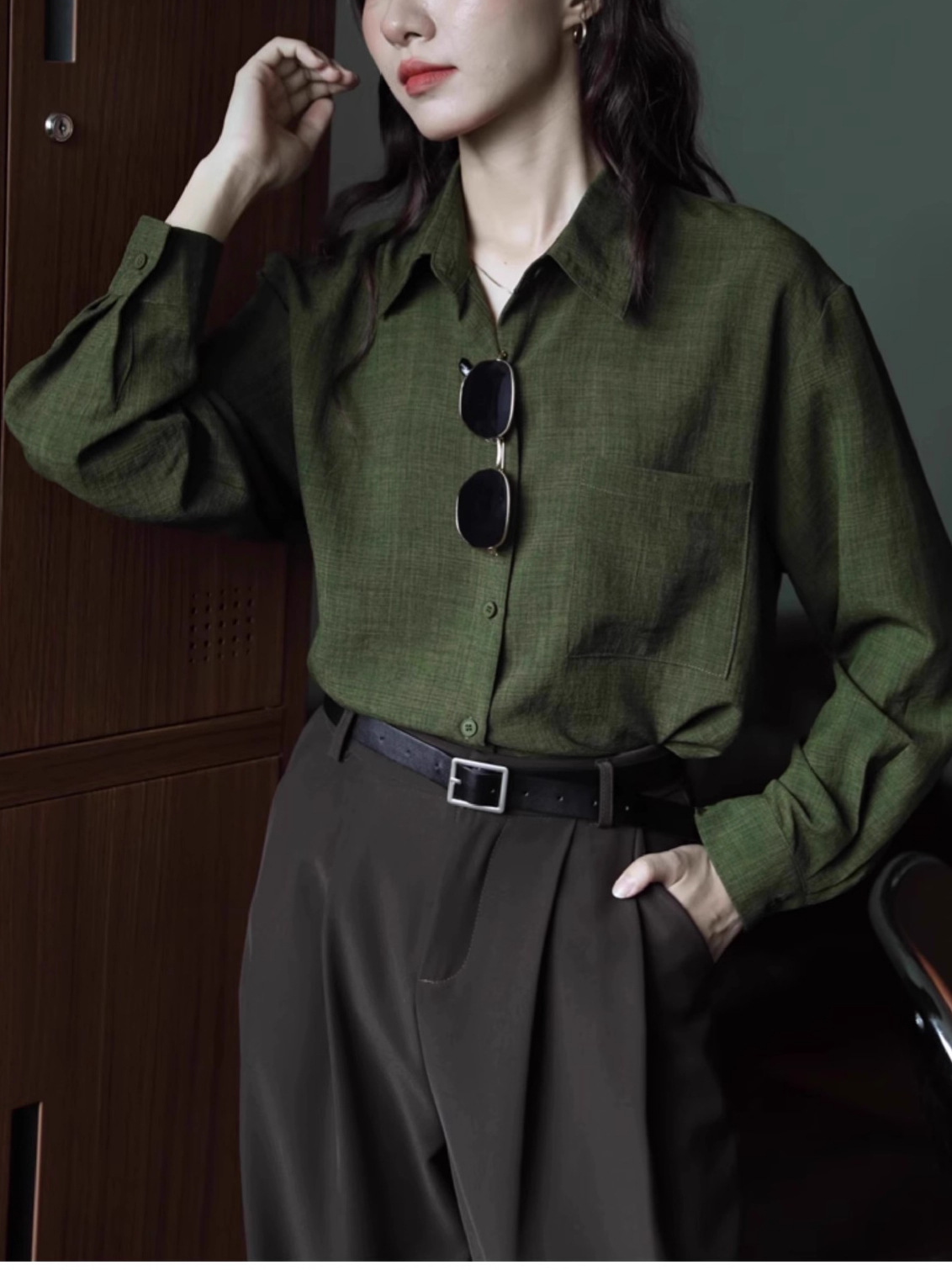 Green Design, Loose-fitting Retro Solid Color Long-sleeved Shirt, Slimming Blouse For Women.