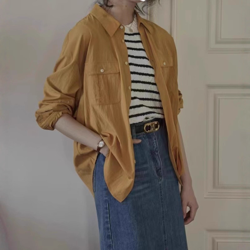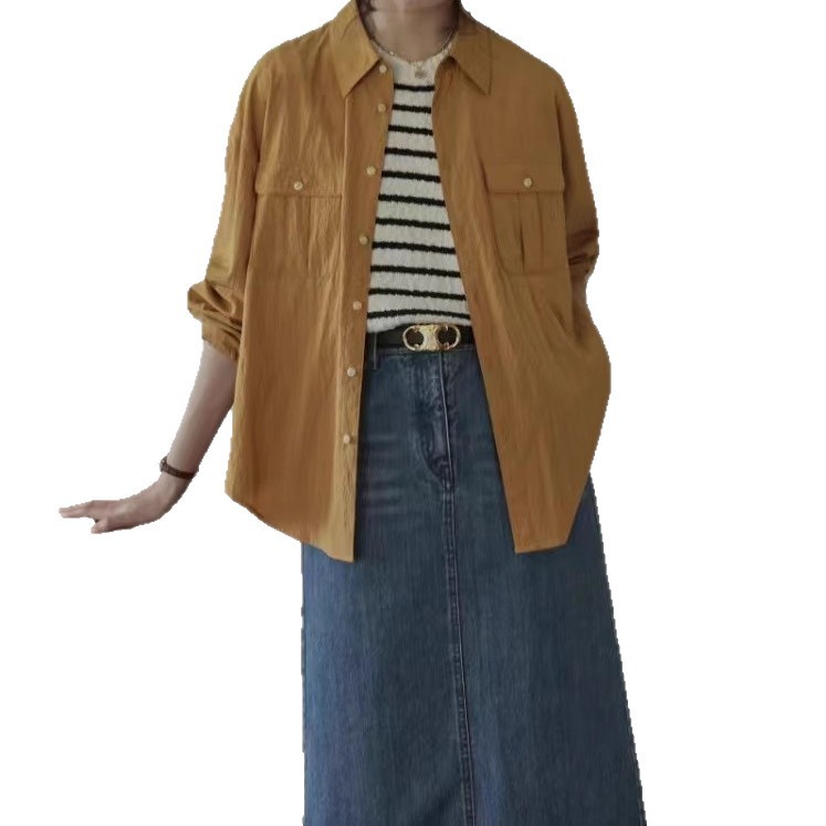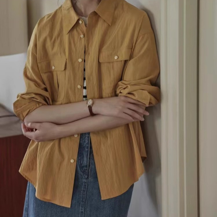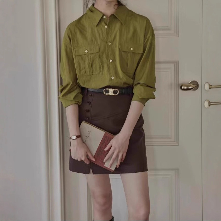 French Retro Green Shirt With Unique Wrinkled Texture And Three-dimensional Patch Pockets, A Sophisticated Layered Shirt.