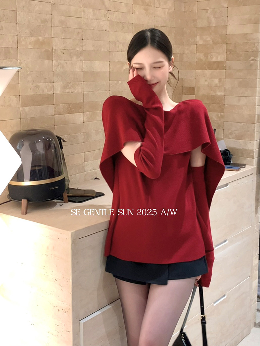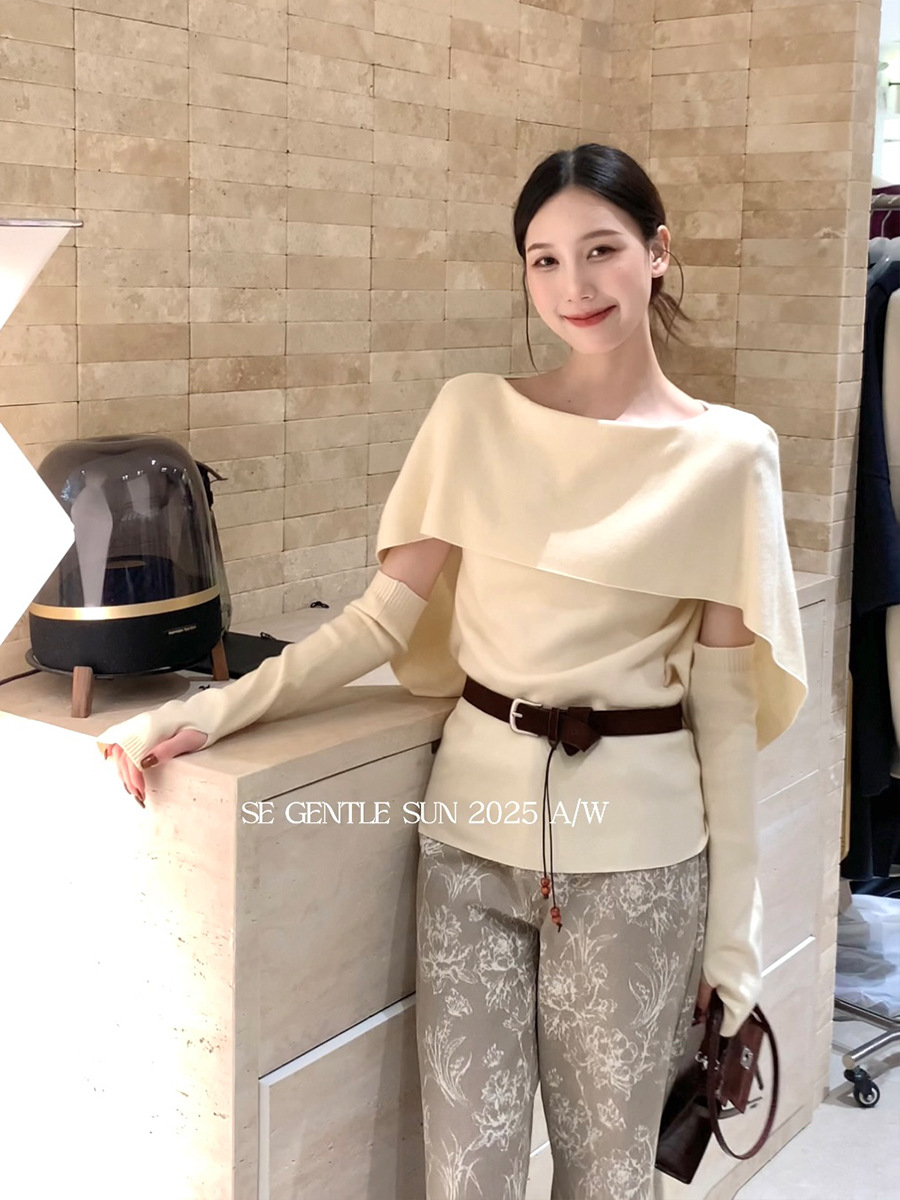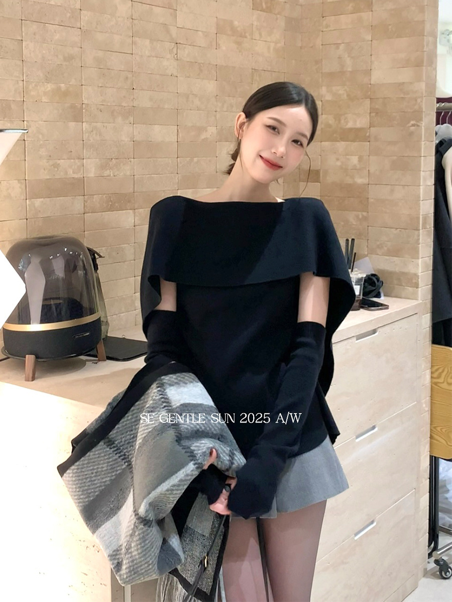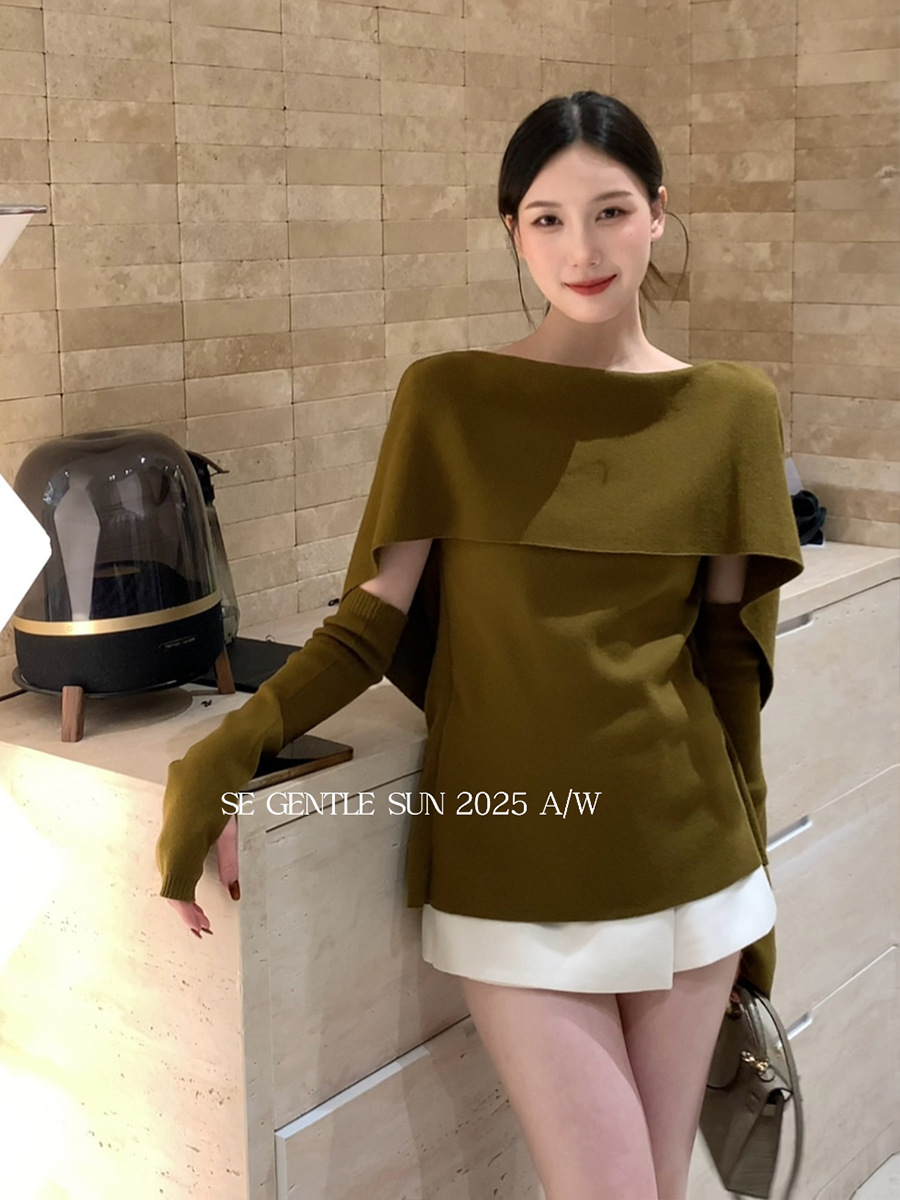 Elegant Round Neck Cape Design Base Layer Knit Sweater Top