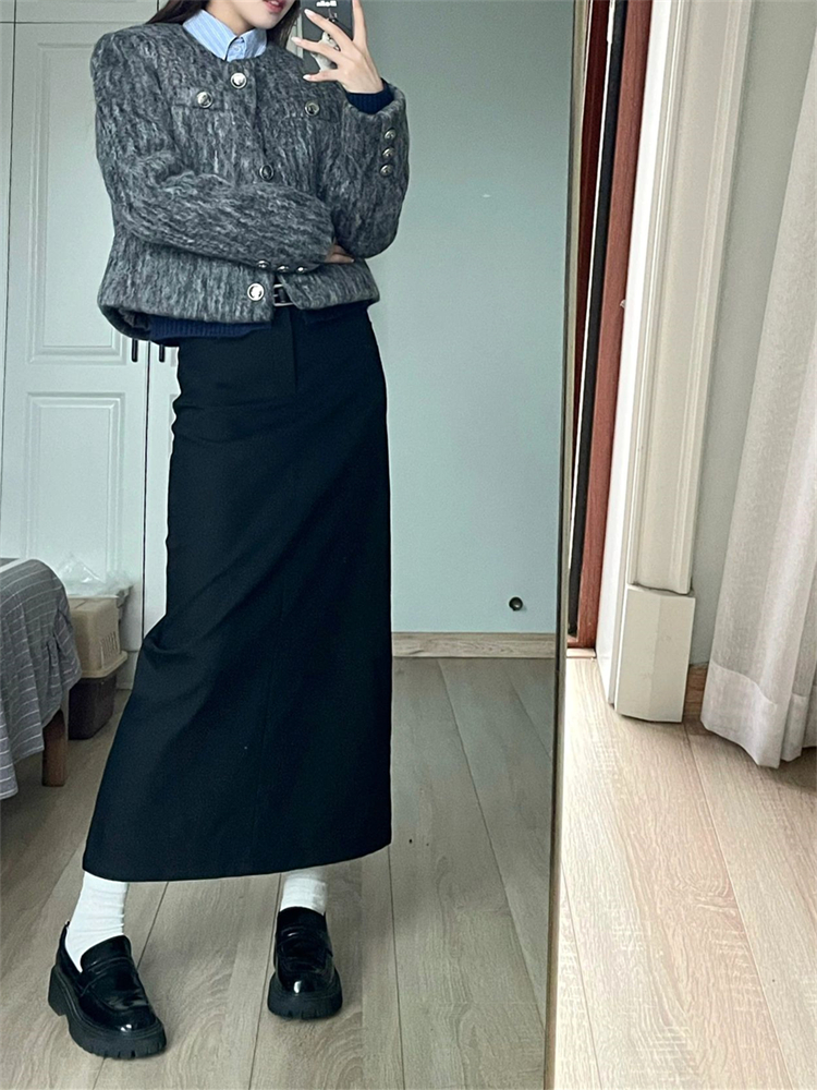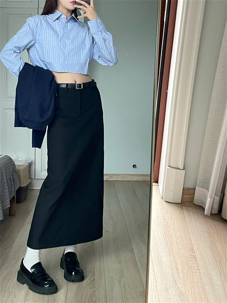 Preppy Style Black Suit Skirt For Plus-size Women, High-waisted, Slimming A-line Skirt, Straight Cut, Unique And Elegant Long Skirt.