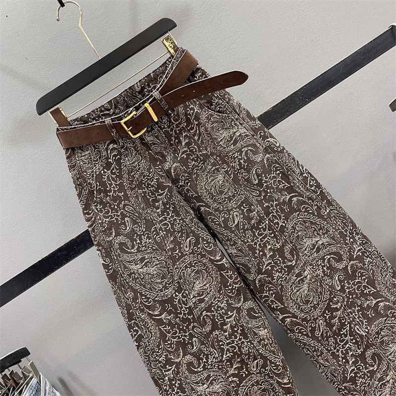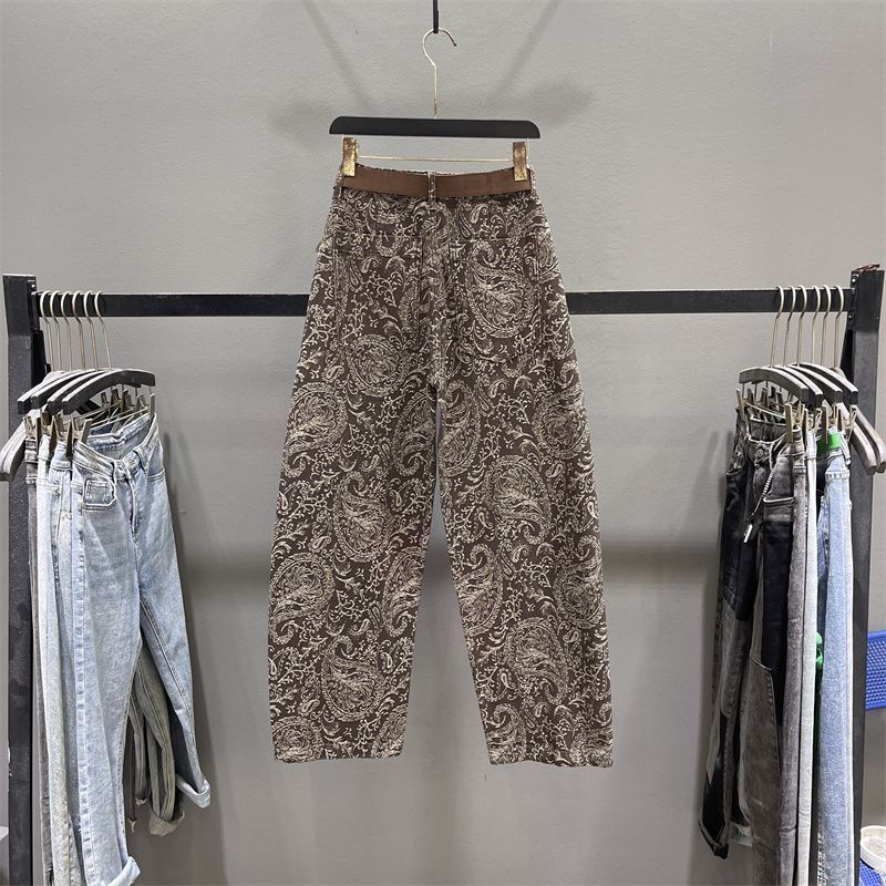 American Retro Jacquard Denim Jeans For Women, High-waisted, Loose-fitting, Stylish Wide-leg Sloping Trousers, Banana Pants.