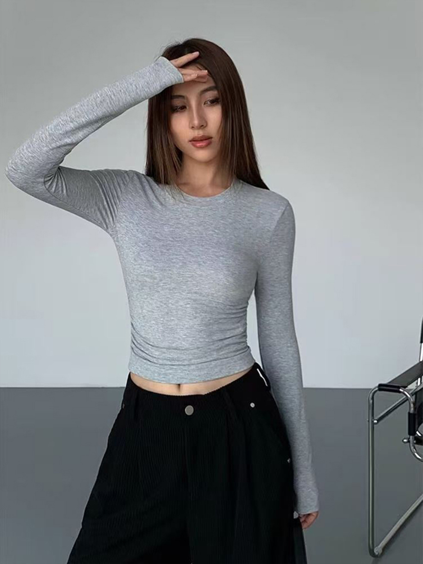Korean Style Fitted Long-sleeved T-shirt With Pointed Shoulders And Cropped Waist.