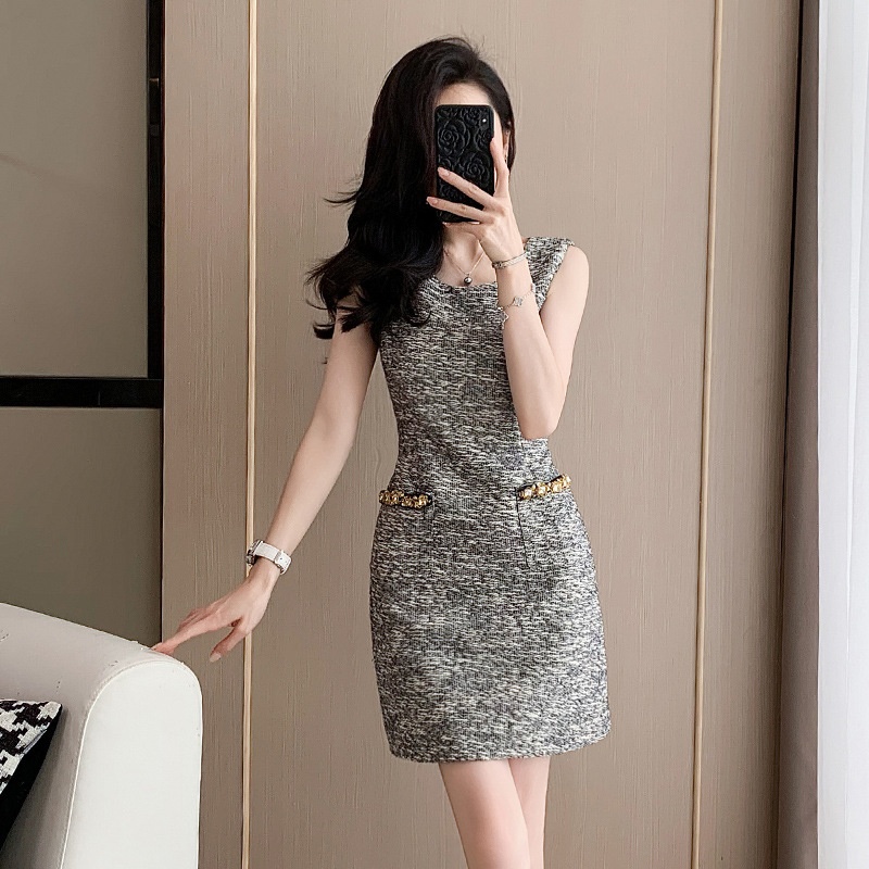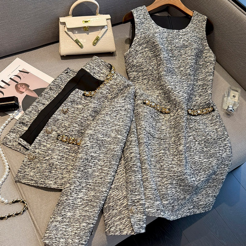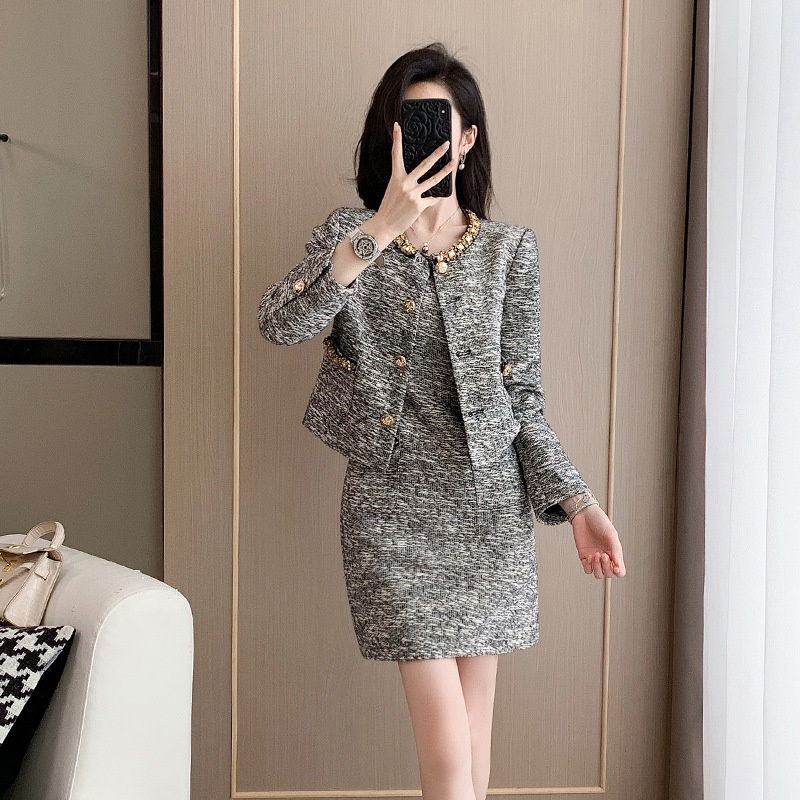 French Chanel-style Tweed Sequined Long-sleeved Short Jacket For Women, Perfect For Autumn And Winter, Paired With A Bodycon Skirt.