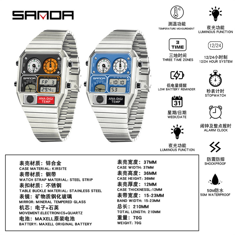 Sanda Electronics Thermometer Timer Multifunctional Men's Watch Retro Square Waterproof Men's Watch