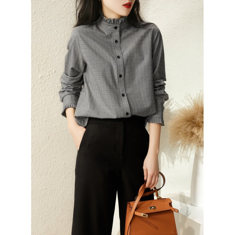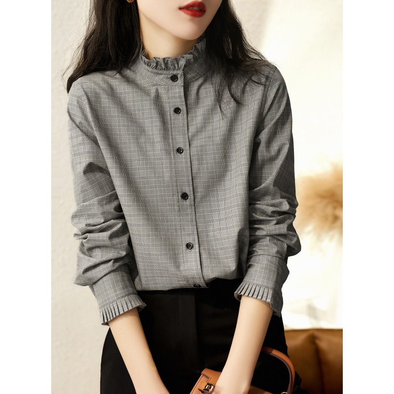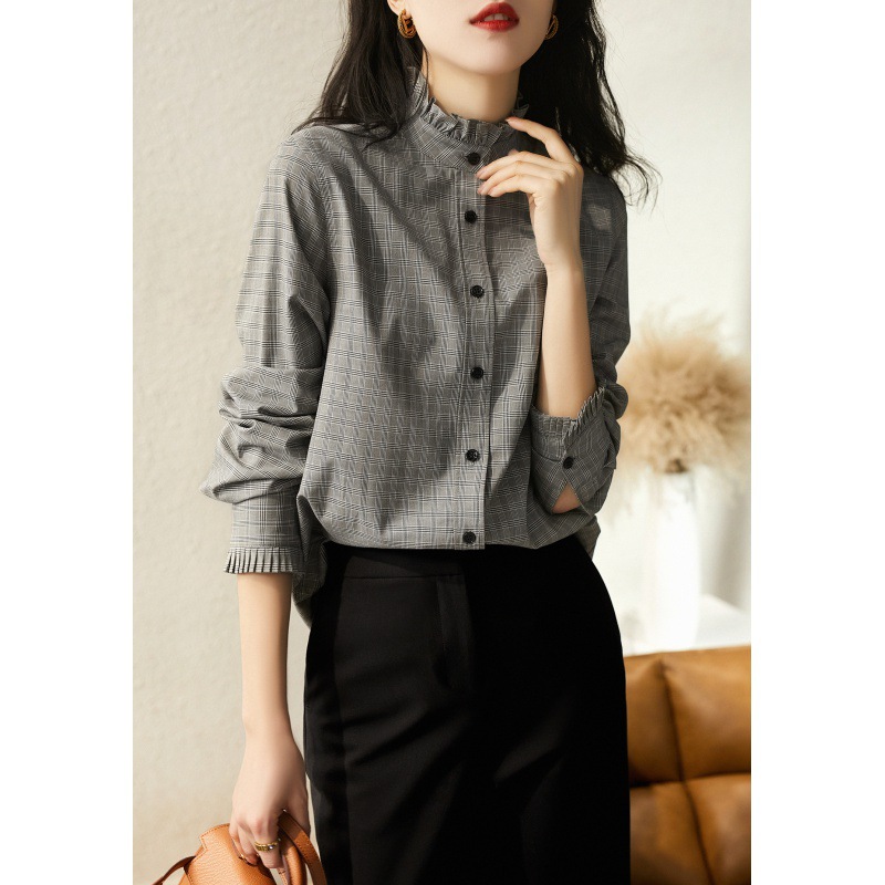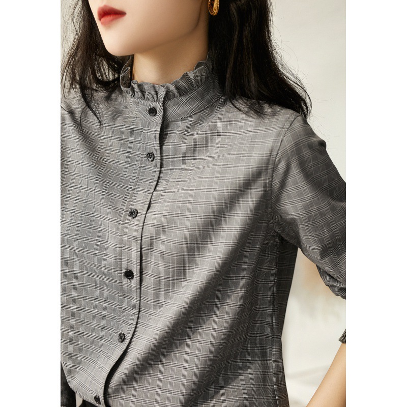 Japanese And Korean Work Clothing Stand-Up Collar Plaid Shirt Retro Hong Kong Style Design Niche Top