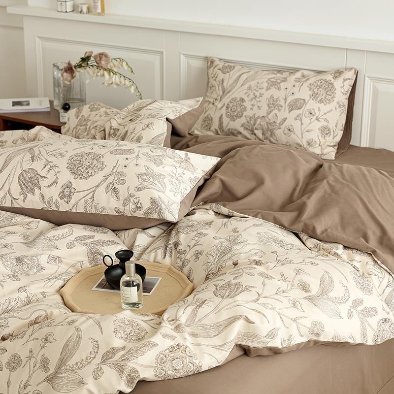 American Gray Small Floral Thickened Brushed Four-piece Set Pure Cotton Literary Art1.5m1.8m Quilt Cover Bed Sheet