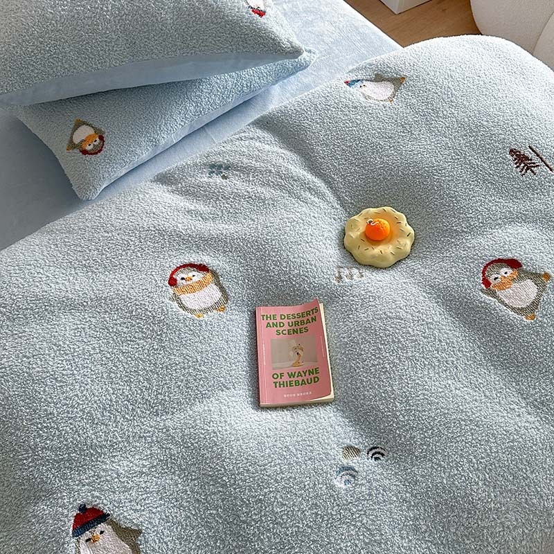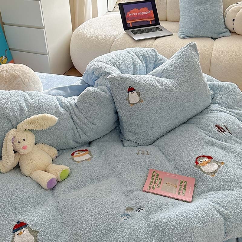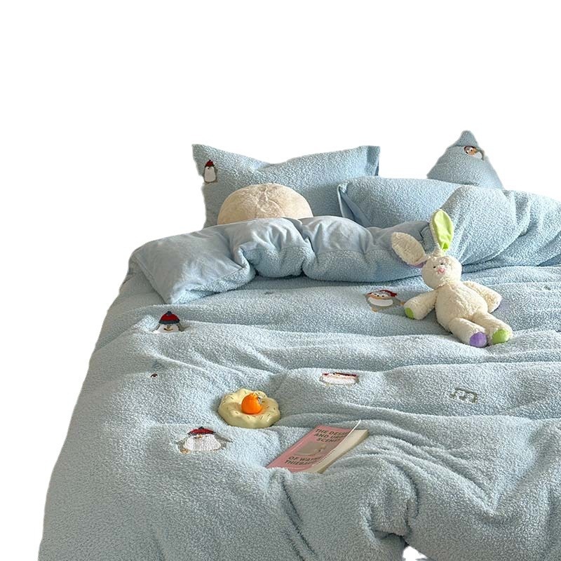 Cream Blue Thickened Teddy Velvet Towel Embroidered Little Penguin Four-piece Set1.5m1.8 Milk Velvet Autumn And Winter Warmth