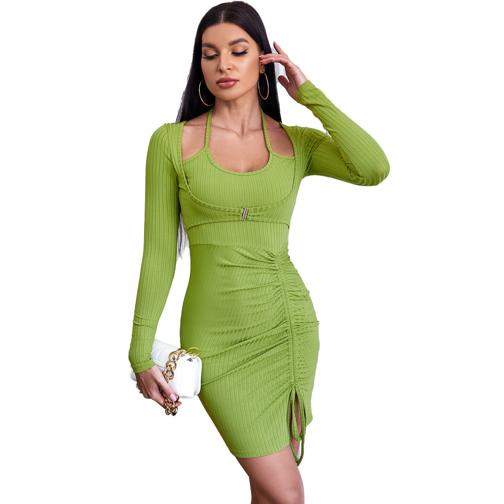 European And American Women's Clothing Fake Two-piece Pleated Slim Hip Skirt Knitted Long-sleeved Short Skirt Mini Dress