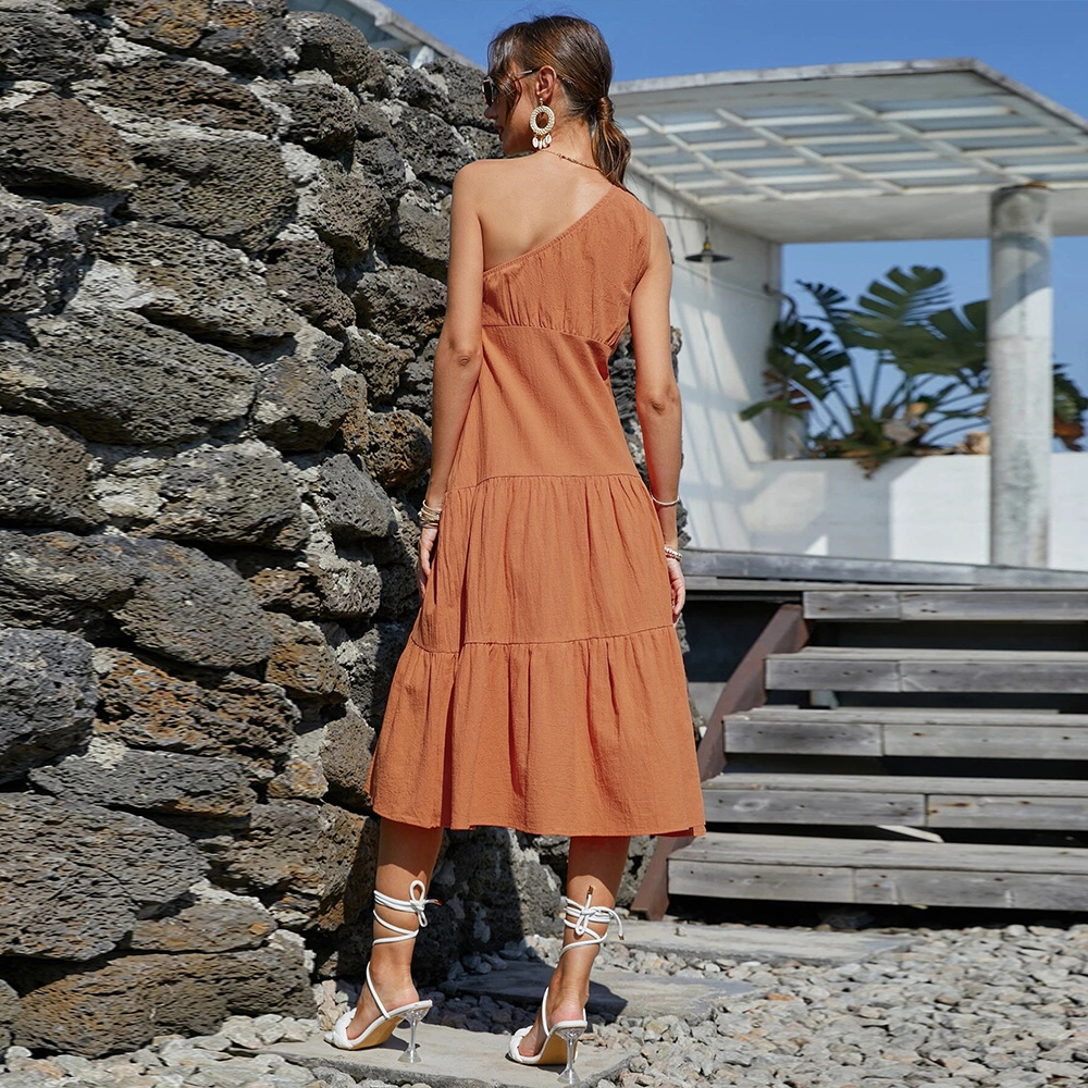 Women's Temperament Commuter Long Skirt Solid Color Suspender Vacation Pastoral Sloped Shoulder Orange Dress