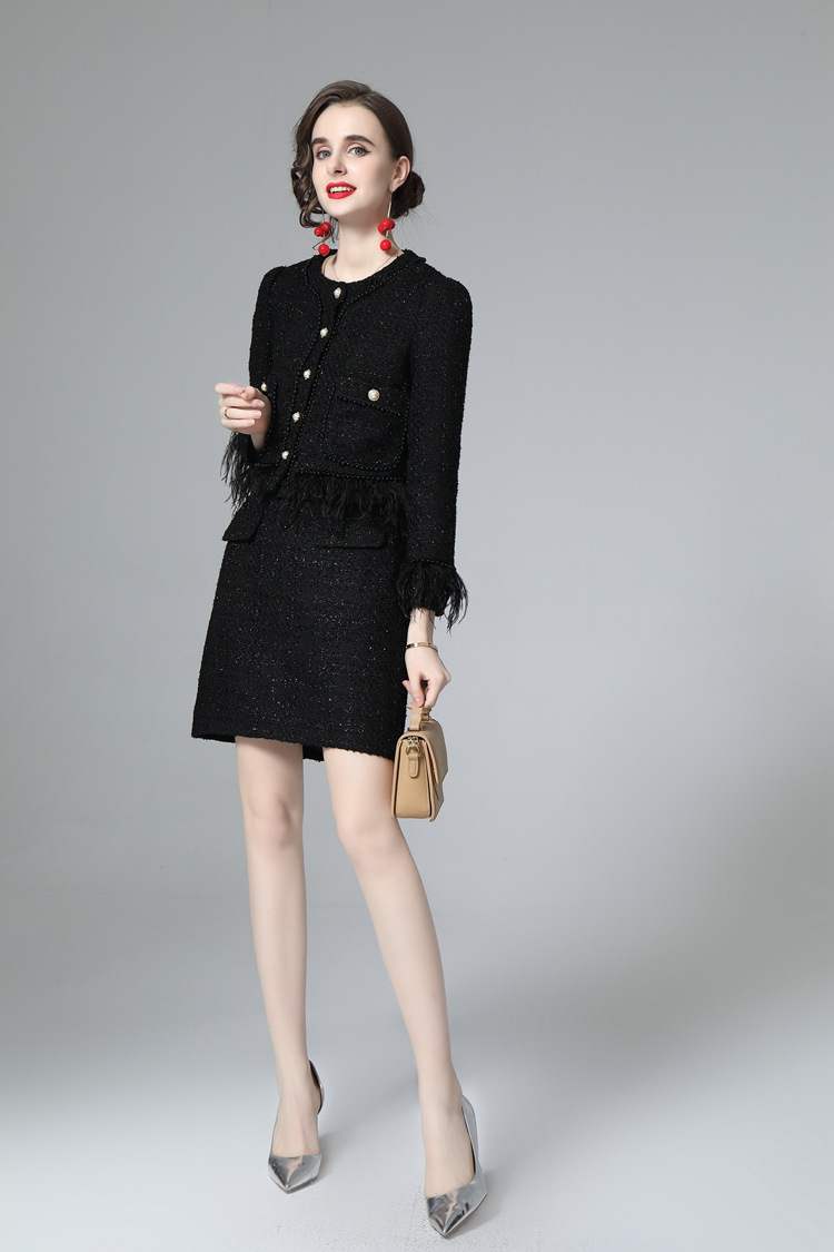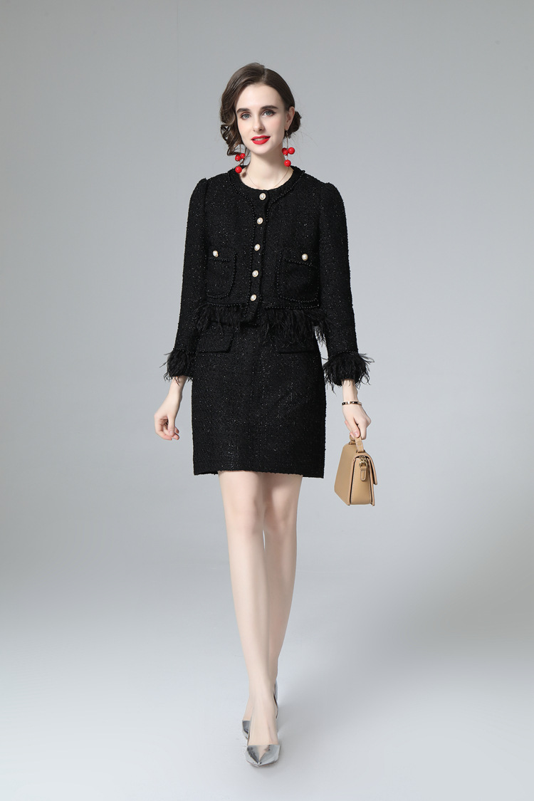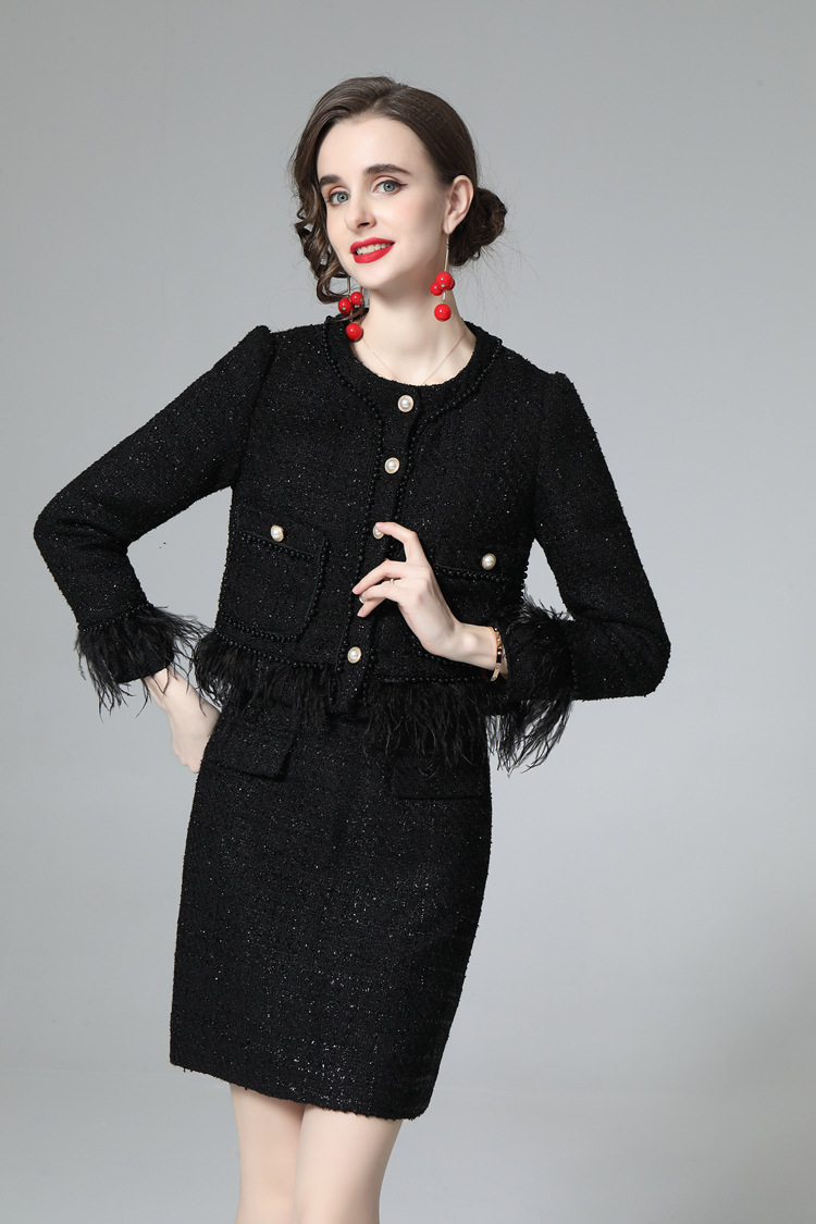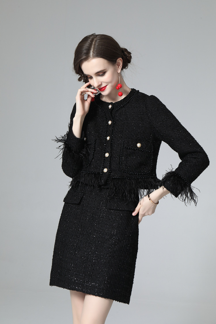 European And American Women's Autumn And Winter Small Fragrance Style Plush Jacket Temperament Commuting Pure Black Split Fashion Skirt Suit218604