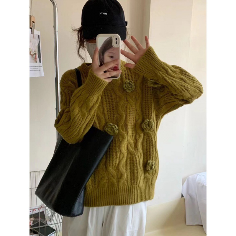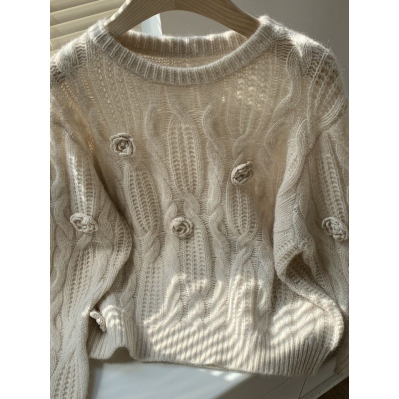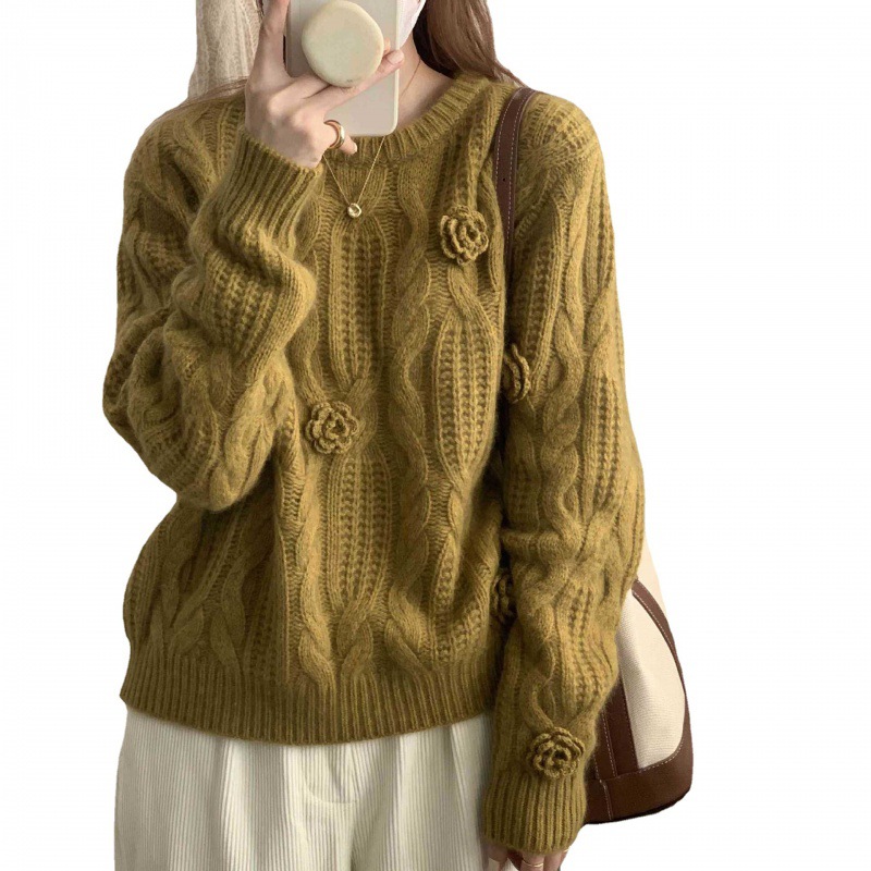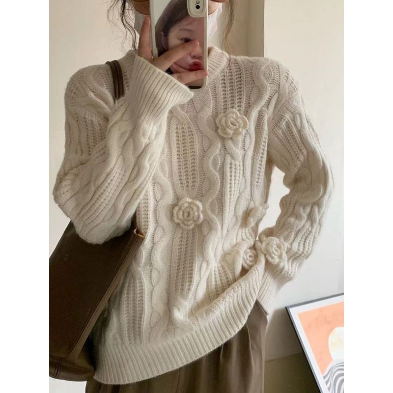 Autumn And Winter Style Knitted Sweaters For Women With Niche And Chic Three-dimensional Embroidery Rose Crochet Soft And Waxy Loose Sweaters For Women