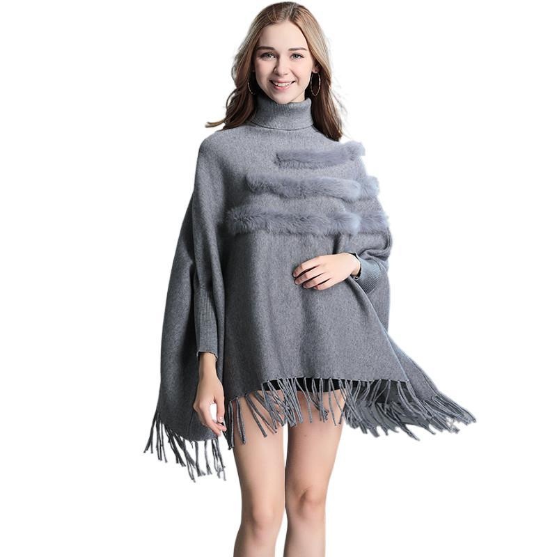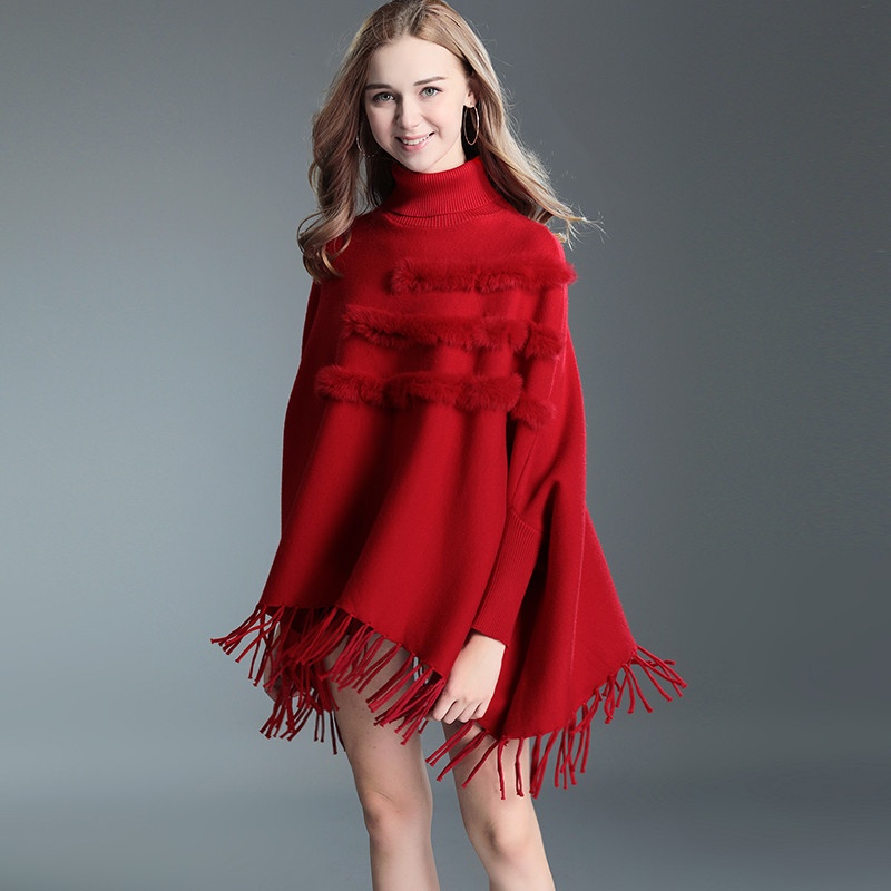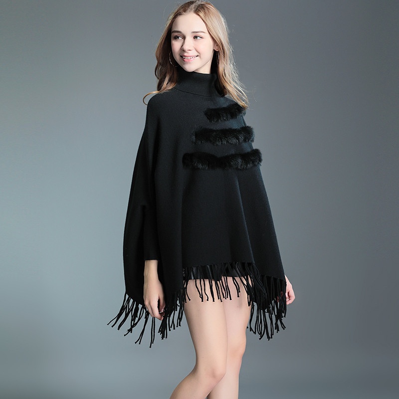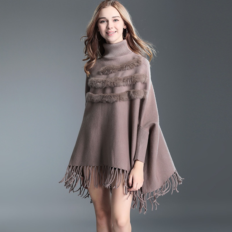 335# Autumn And Winter Large Size Tassel Cape Shawl Women's Bat Sleeve Sweater Mid-length Turtleneck Sweater Jacket