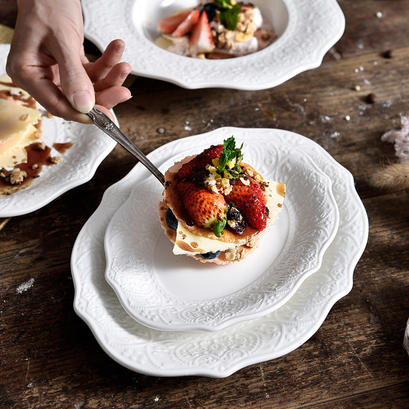 Lace Plate Retro Nordic Style Tableware Ceramic Household Dessert Plate Western Steak Plate Solid Color Dumpling Plate