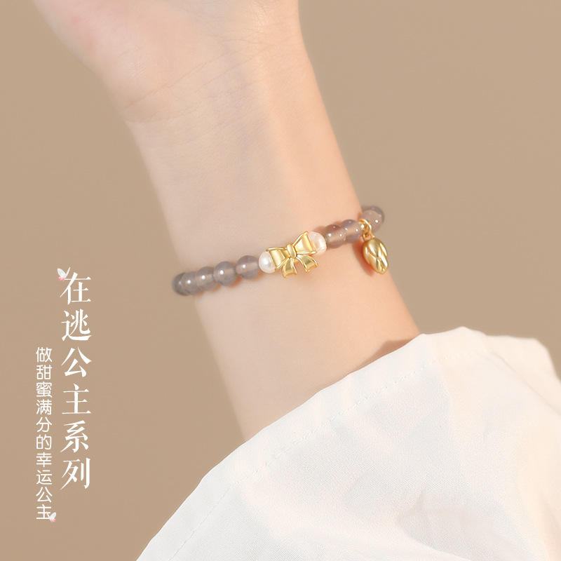 [ Princess On The Run] Natural Gray Agate Crystal Bracelet Girls Bow Lotus Hand Accessories Gift Street Stall