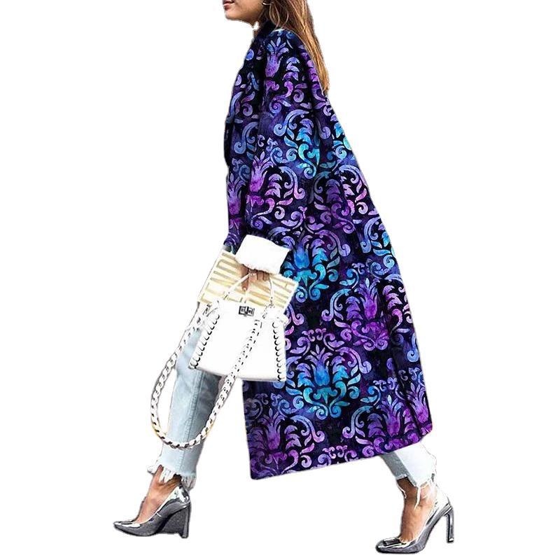 Autumn And Winter Product Independent Station Extended Double-breasted Jacket Printed Loose Windbreaker For Women