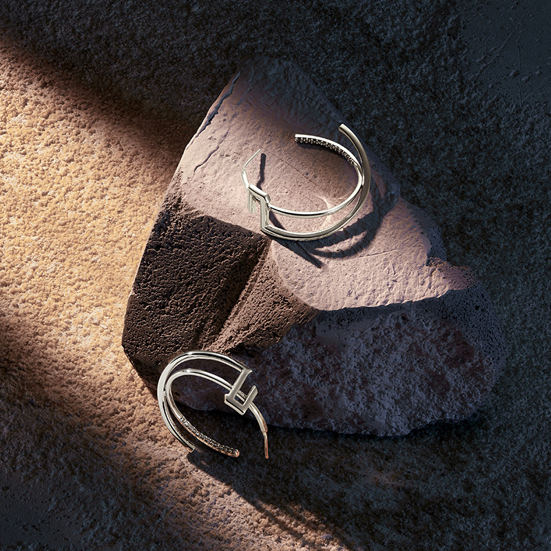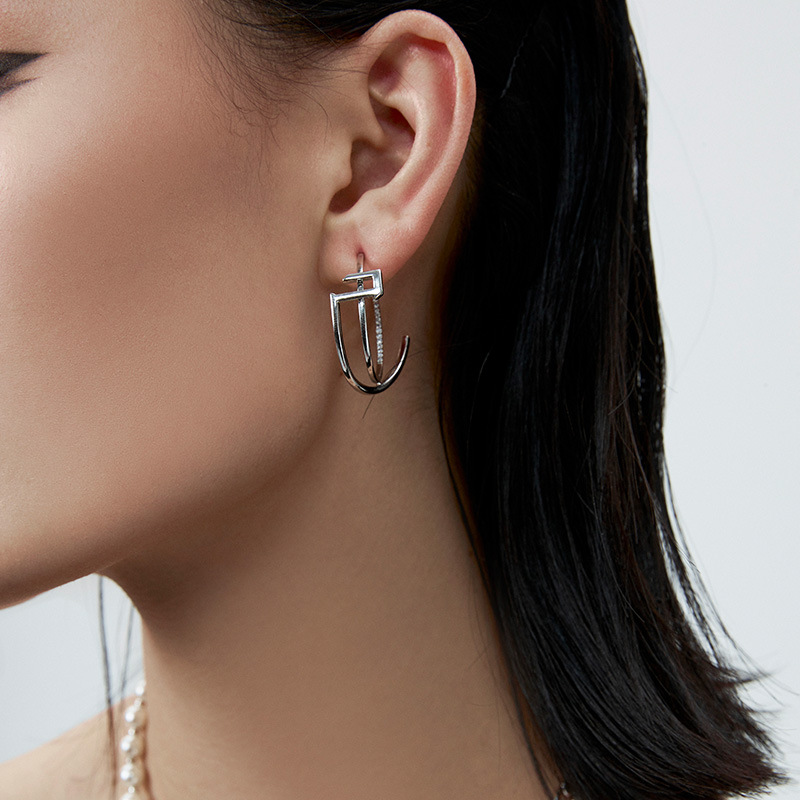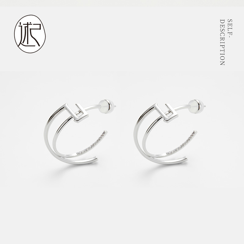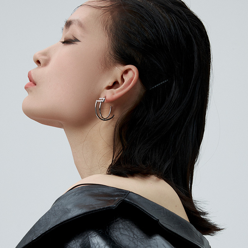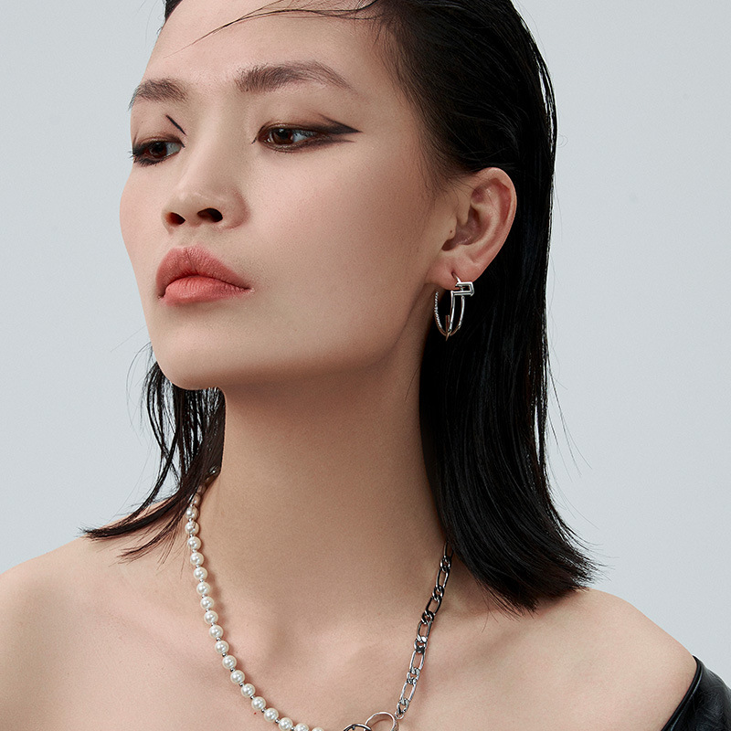 Shujiguo Cold Style Earrings S925 Silver Needle Earrings C-shaped Cross Earrings Geometric Hollow Large Earrings