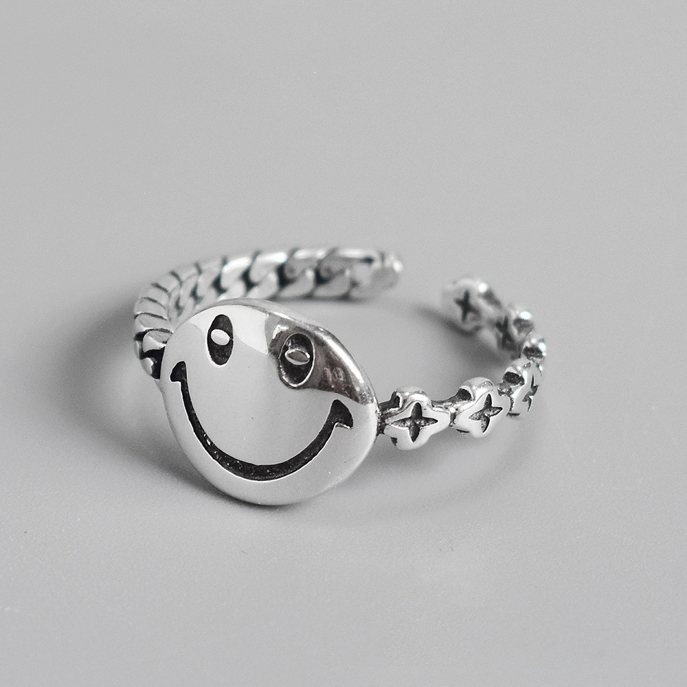 South Korea Dongdaemun Style925 Sterling Silver Smiley Ring Women's Cross Chain Internet Celebrity Index Finger Ring Open Ring Adjustable