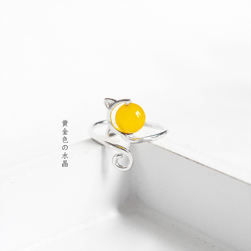 925 Sterling Silver Cat Yellow Crystal Ring Korean Version Cute Personality Female Kitten Crystal Ring Pinky Ring Jewelry